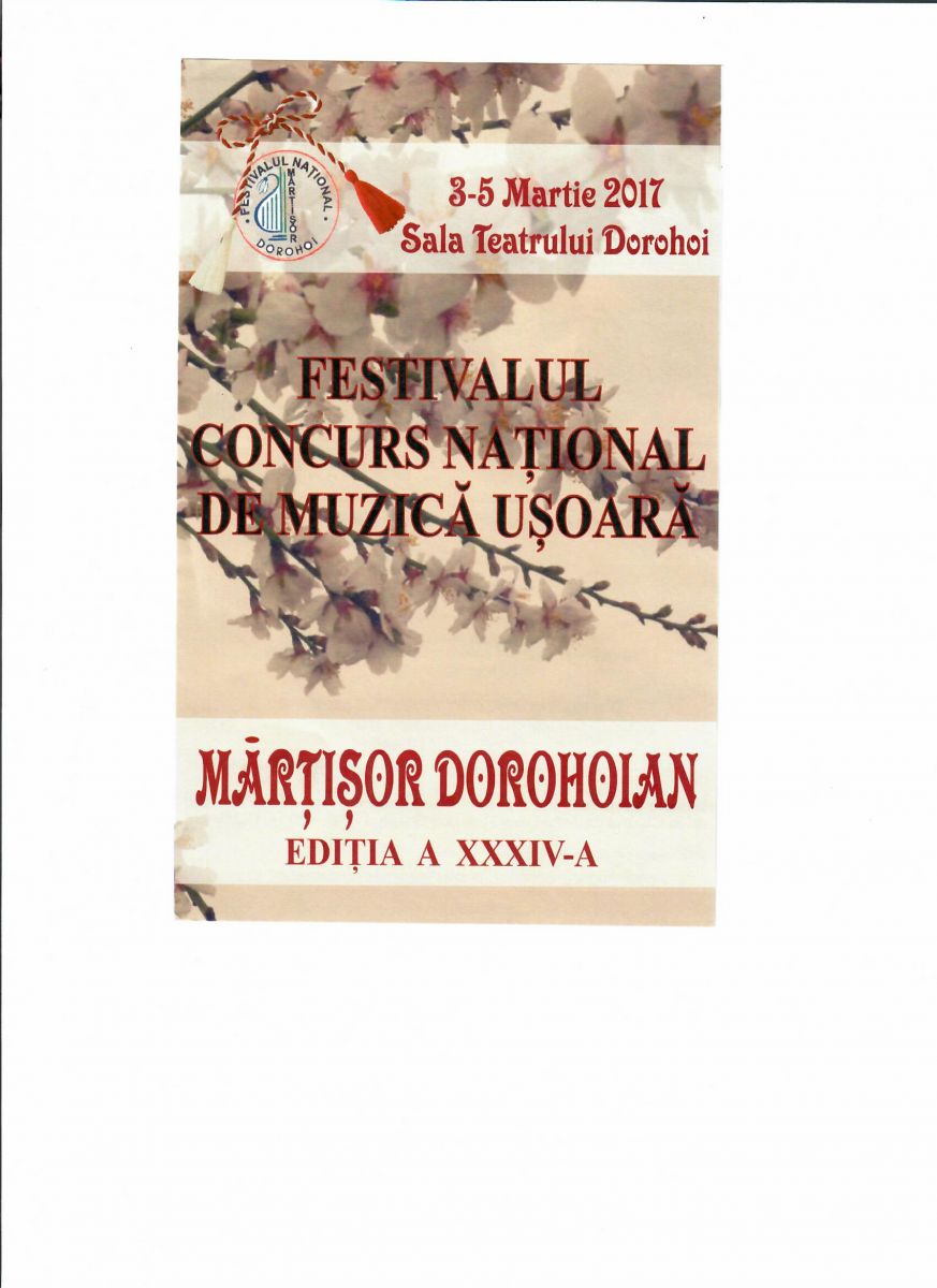 Centrul Judeţean pentru Conservarea şi Promovarea Culturii Tradiţionale Botoşani, instituţie de cultură aflată în subordinea Consiliului Judeţean Botoşani, în parteneriat cu Primăria Municipiului Dorohoi, Consiliul Local Dorohoi şi Casa de Cultură Dorohoi, organizează Festivalul Naţional de Muzică Uşoară Românească “Mărţişor Dorohoian”, ediţia a XXXIV-a.