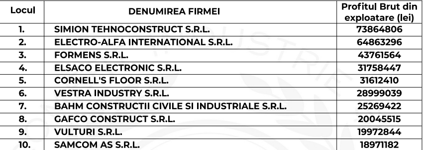 Topul firmelor după profitul brut din exploatare pe situațiile financiare depuse anul trecut este condus de Simion Tehnoconstruct SRL care a realizat un profit de 73.864.806 lei.