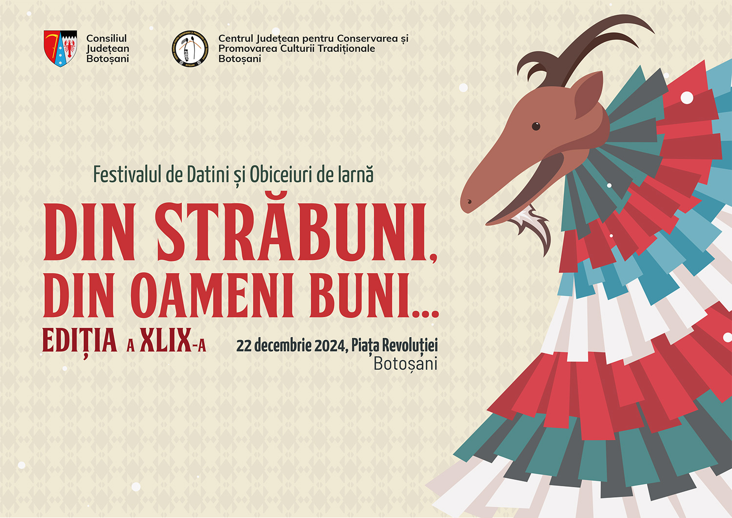 Centrul Judeţean pentru Conservarea și Promovarea Culturii Tradiționale Botoşani, instituţie publică de cultură a Consiliului Judeţean Botoșani, organizează în ziua de 22 decembrie 2024, Festivalul de datini și obiceiuri de iarnă „Din străbuni, din oameni buni...", ediția a XLIX-a, în Piaţa Revoluţiei din Municipiul Botoşani.