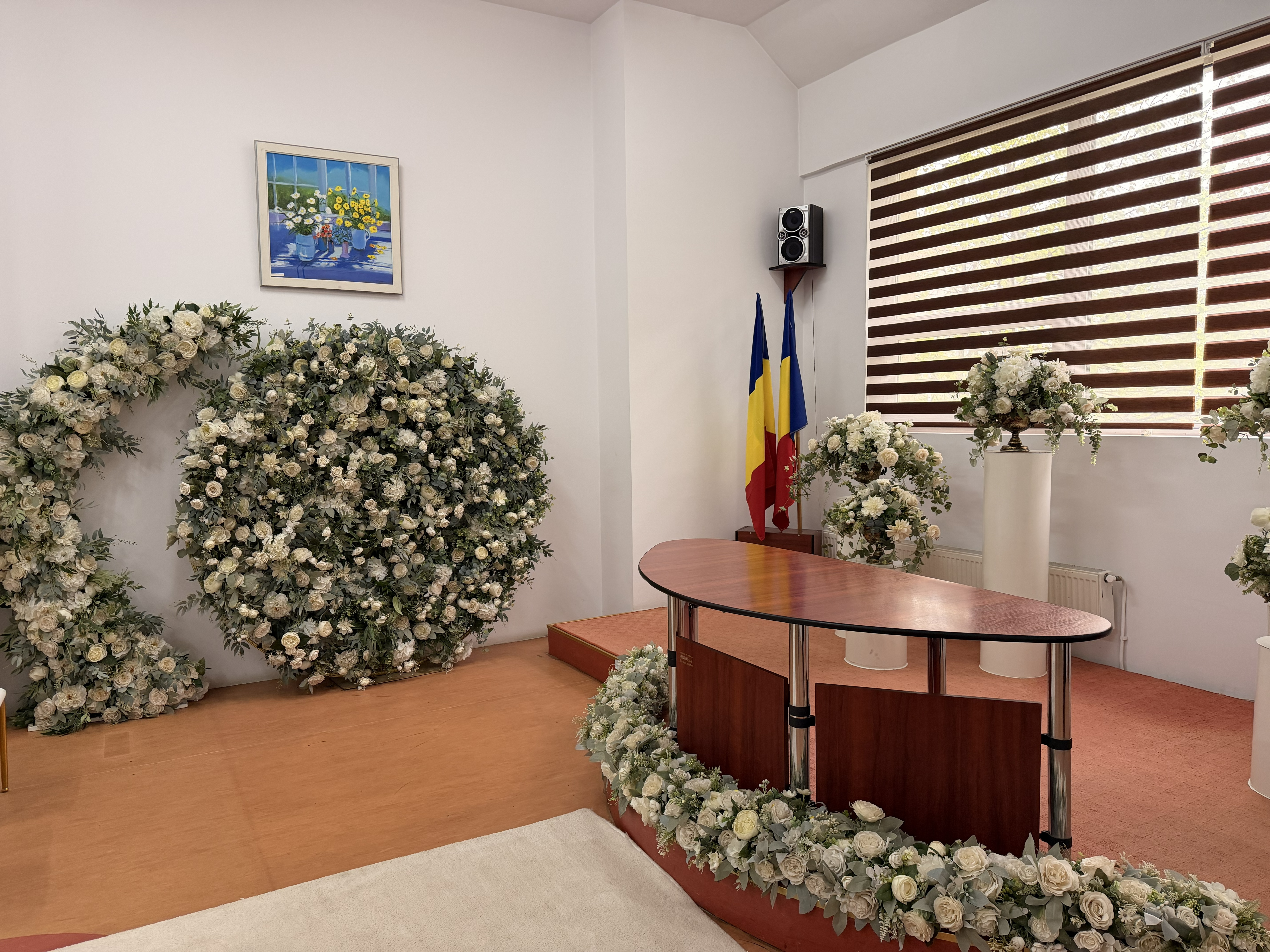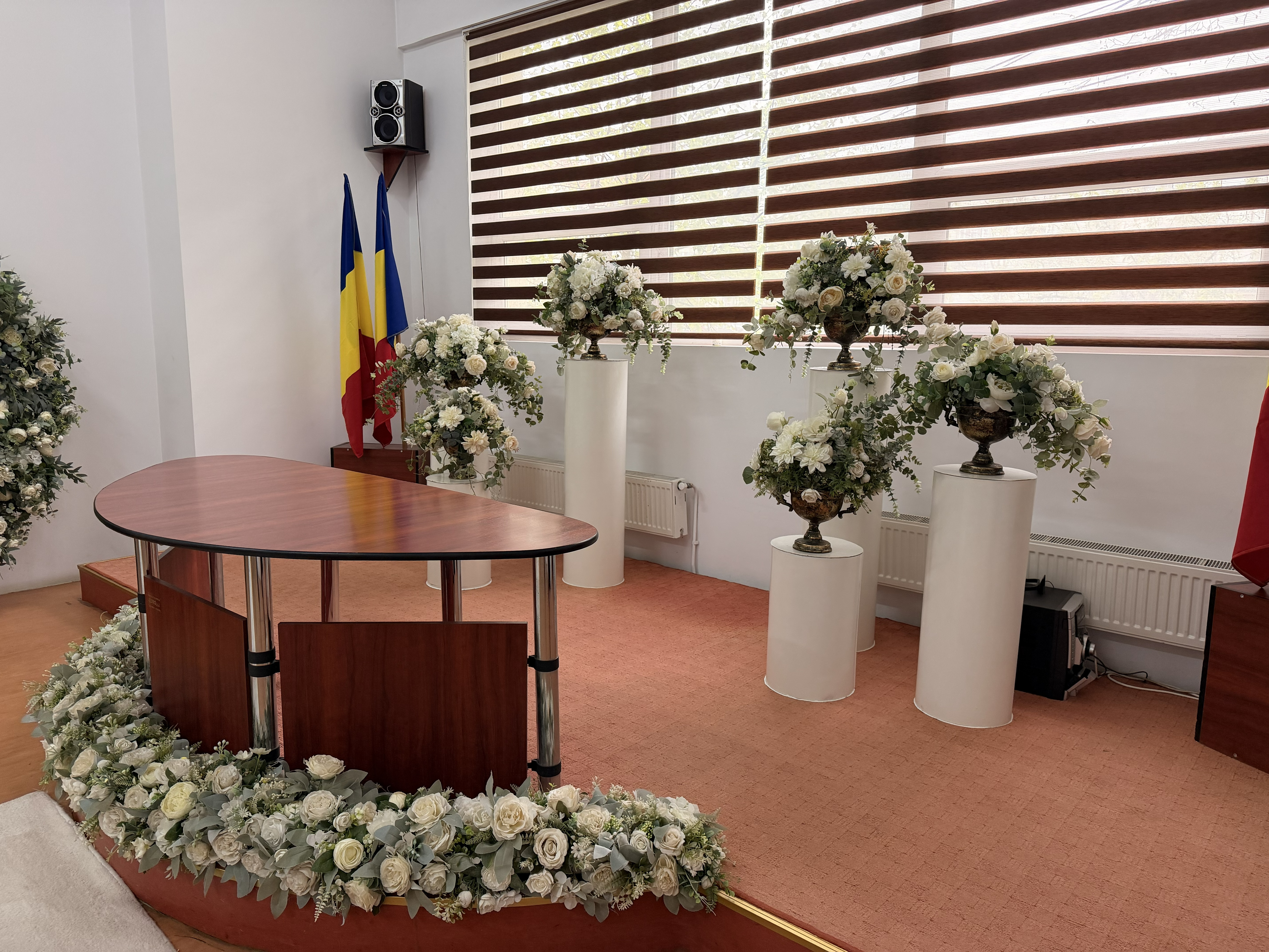 Au fost amplasate scaune elegante, oferind confort invitaților, iar aranjamentele florale adaugă acea notă de emoție și căldură de care au nevoie tinerii în momentul în care aleg să spună „Da” în fața ofițerului de stare civilă.