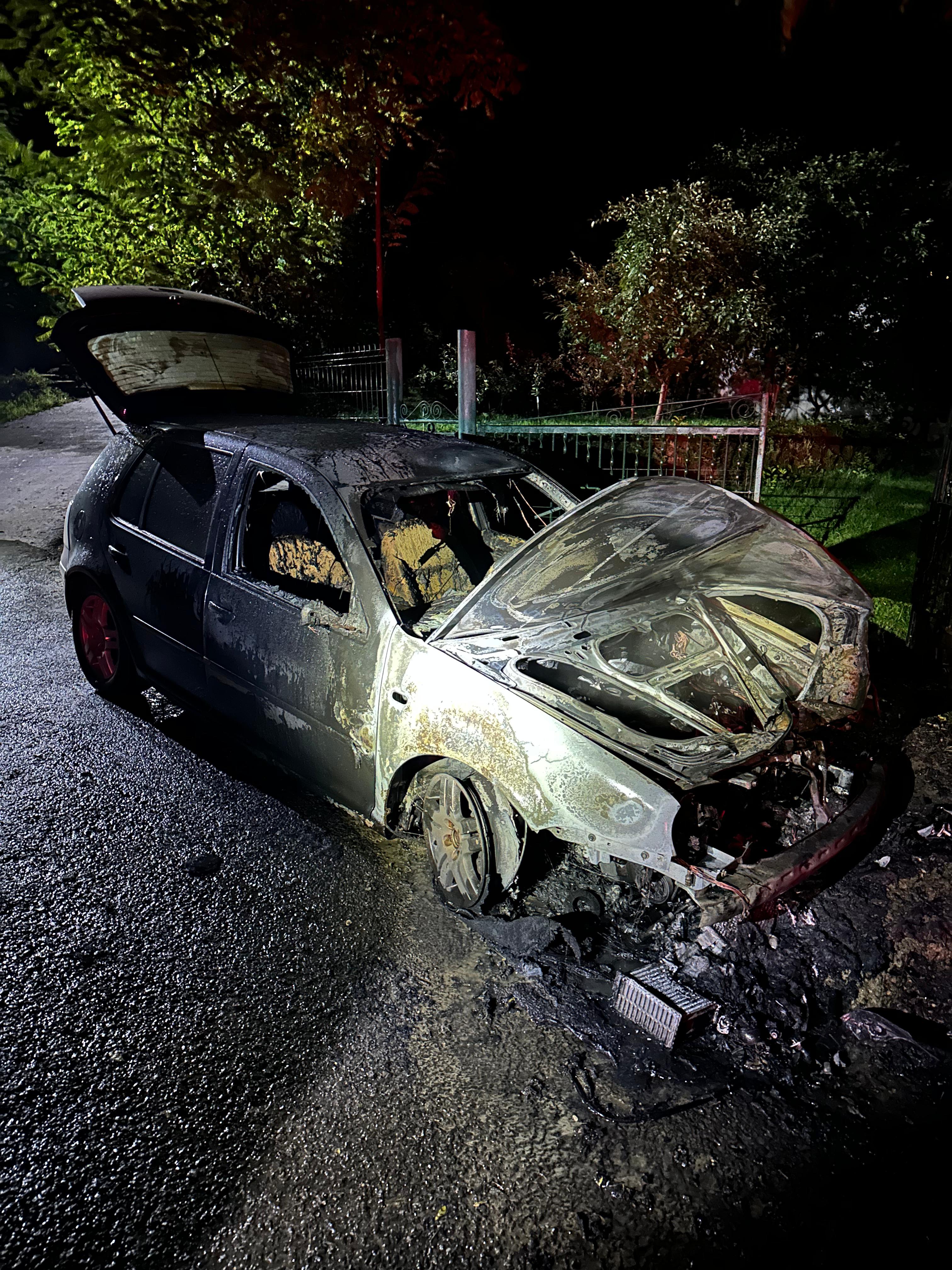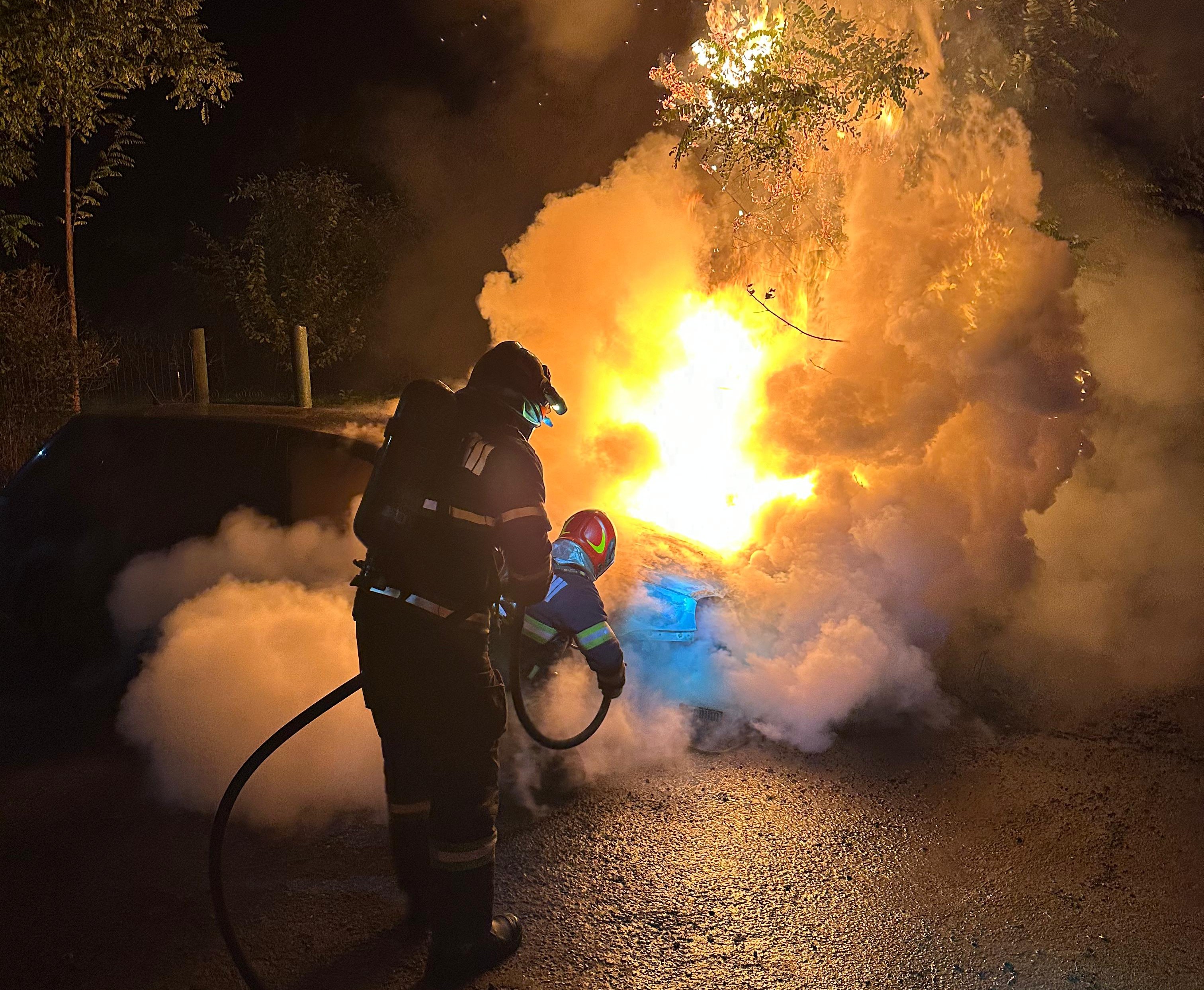 Aceștia au constatat că mașina ardea în proporție de aproximativ 70% și au stins flăcările înainte ca acestea să se extindă la mai mulți arbori din apropiere.