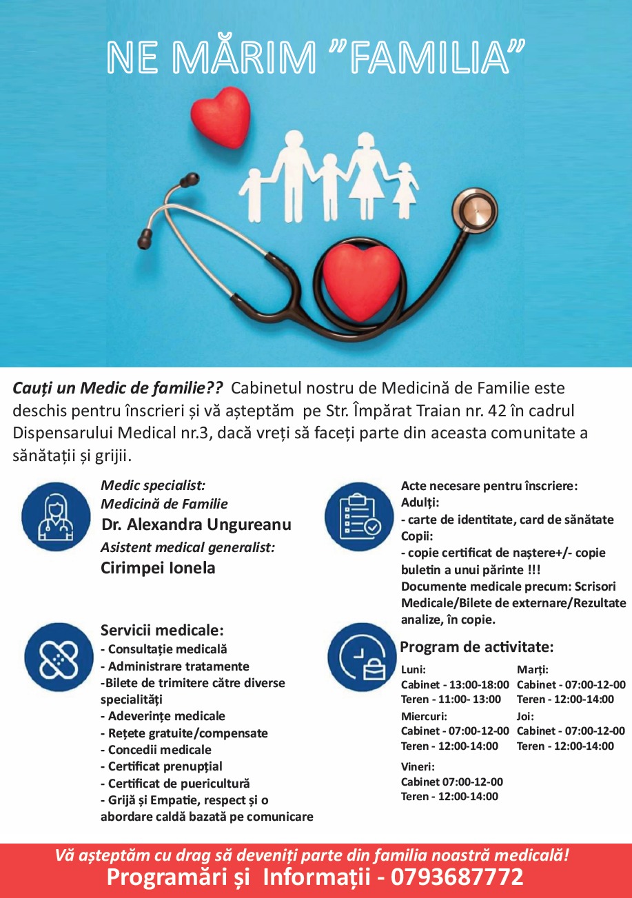 Cei care nu și-au găsit un medic de familie sau care doresc să aibă acces la unul tânăr și entuziast se pot adresa doctorului Alexandra Ungureanu.