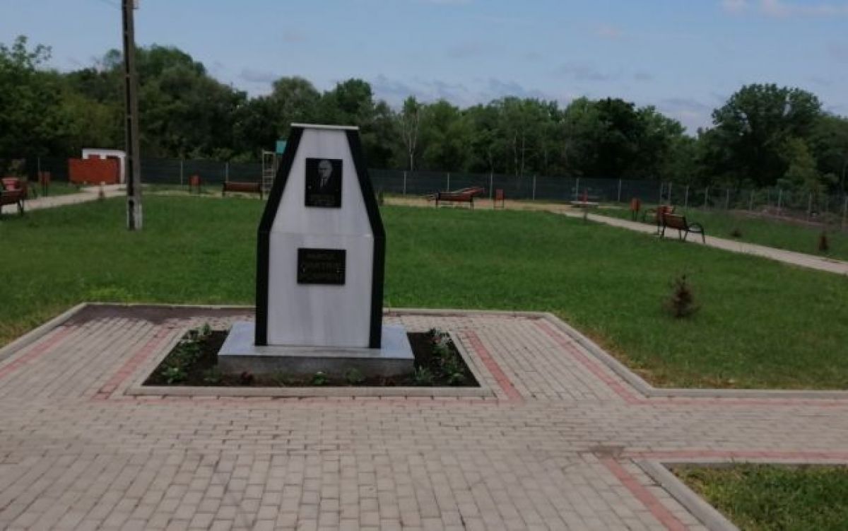 Acesta are o formă care duce cu gândul la un sicriu pe jumătate îngropat în pământ. Pe monument se află chipul matematicianului Dimitrie Pompeiu, născut la Broscăuţi.