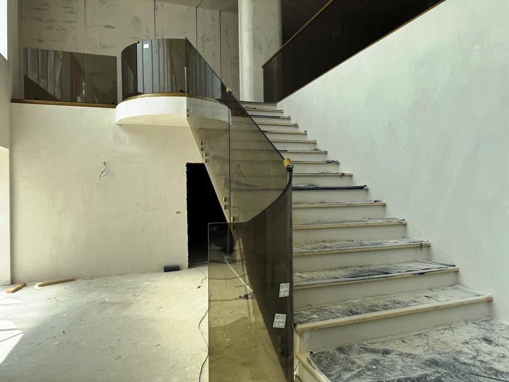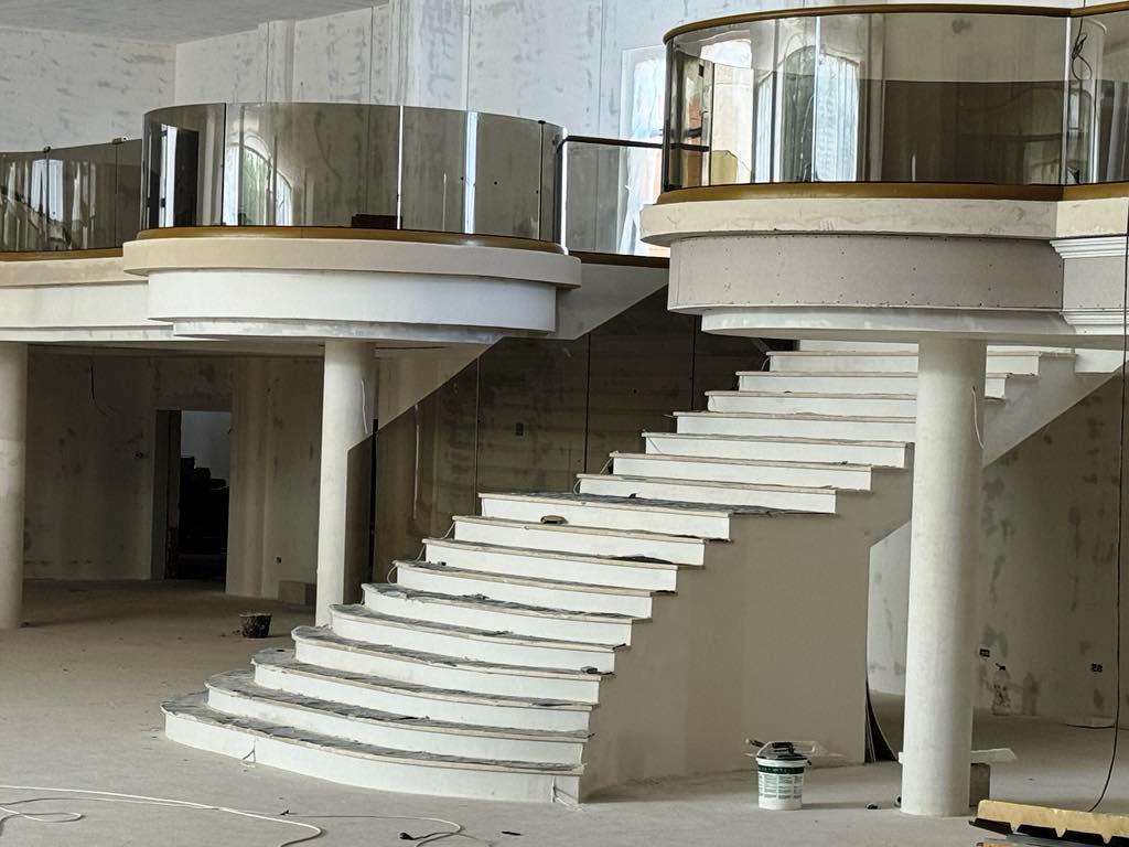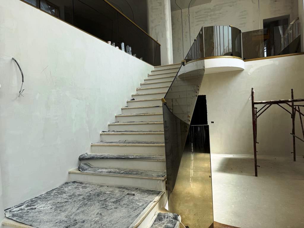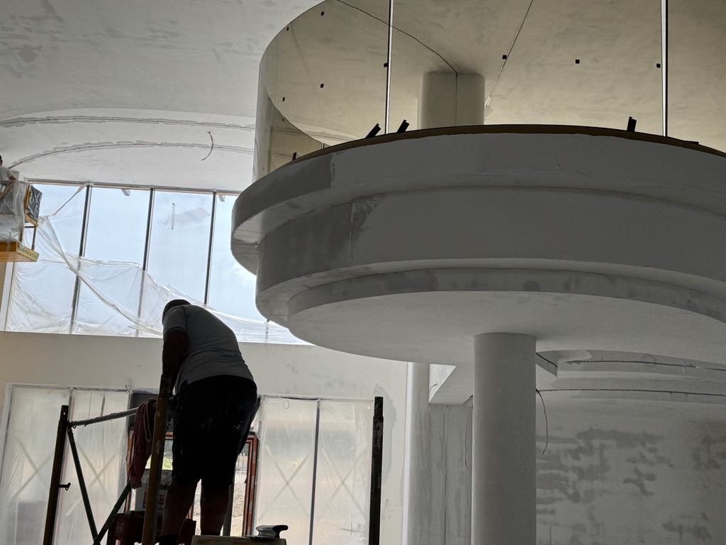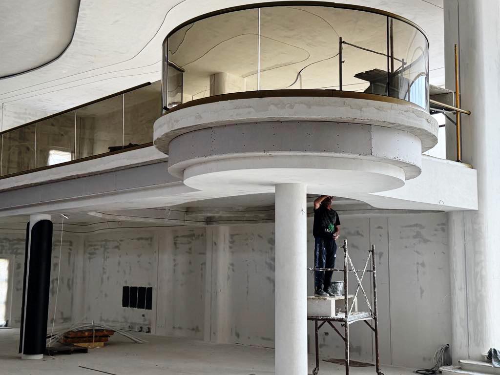 Balustradele circulare din sticlă și jocurile din lumini încastrate în pereți sunt doar două dintre elementele de efect. Și nu prea există unghiuri drepte, conceptul fiind unul circular.