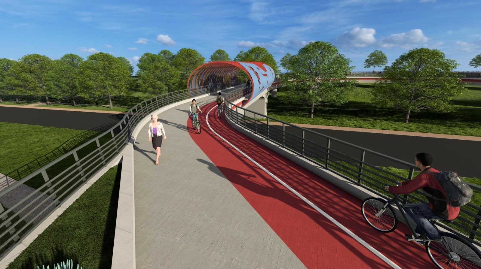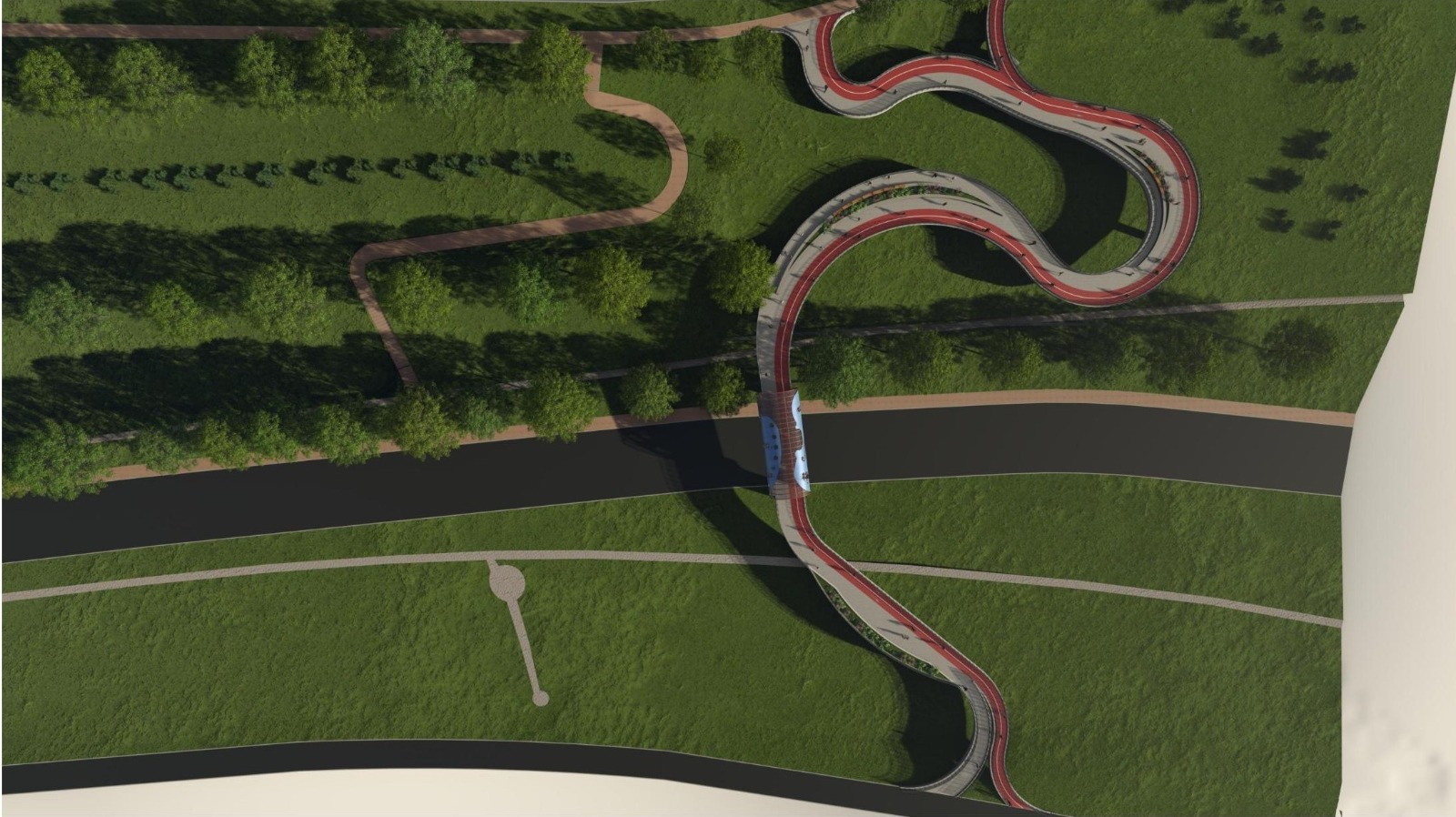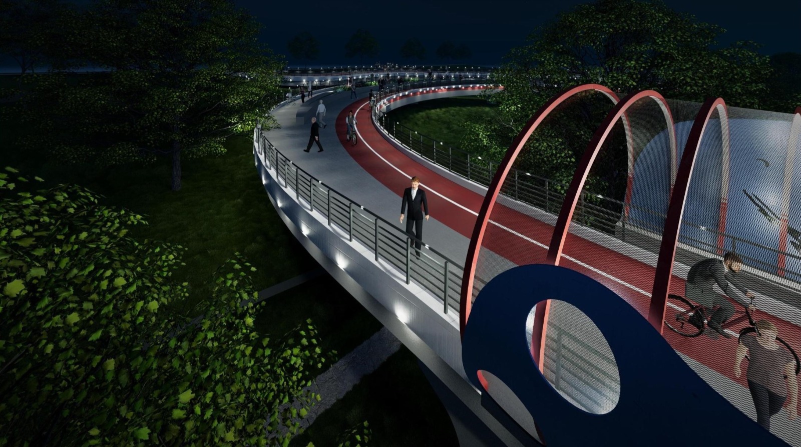 Proiectul prevede amenajarea unei pasarele cu grinzi metalice și dale din beton armat, zonă acoperită, jardiniere, iluminat pietonal și arhitectural.