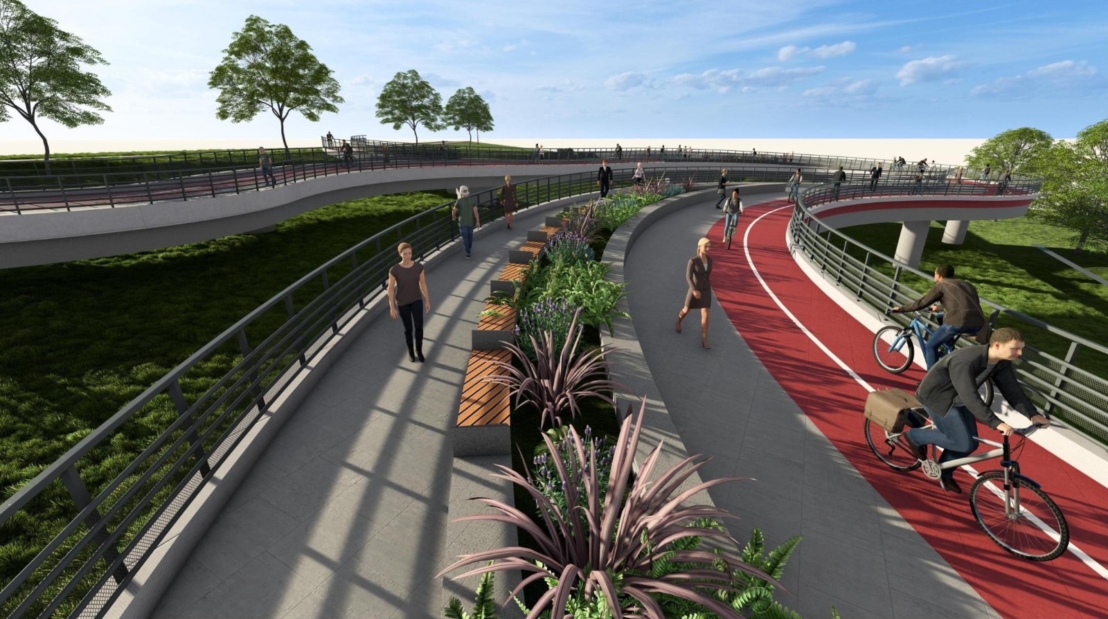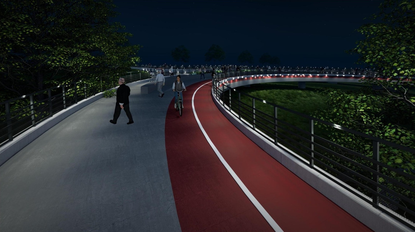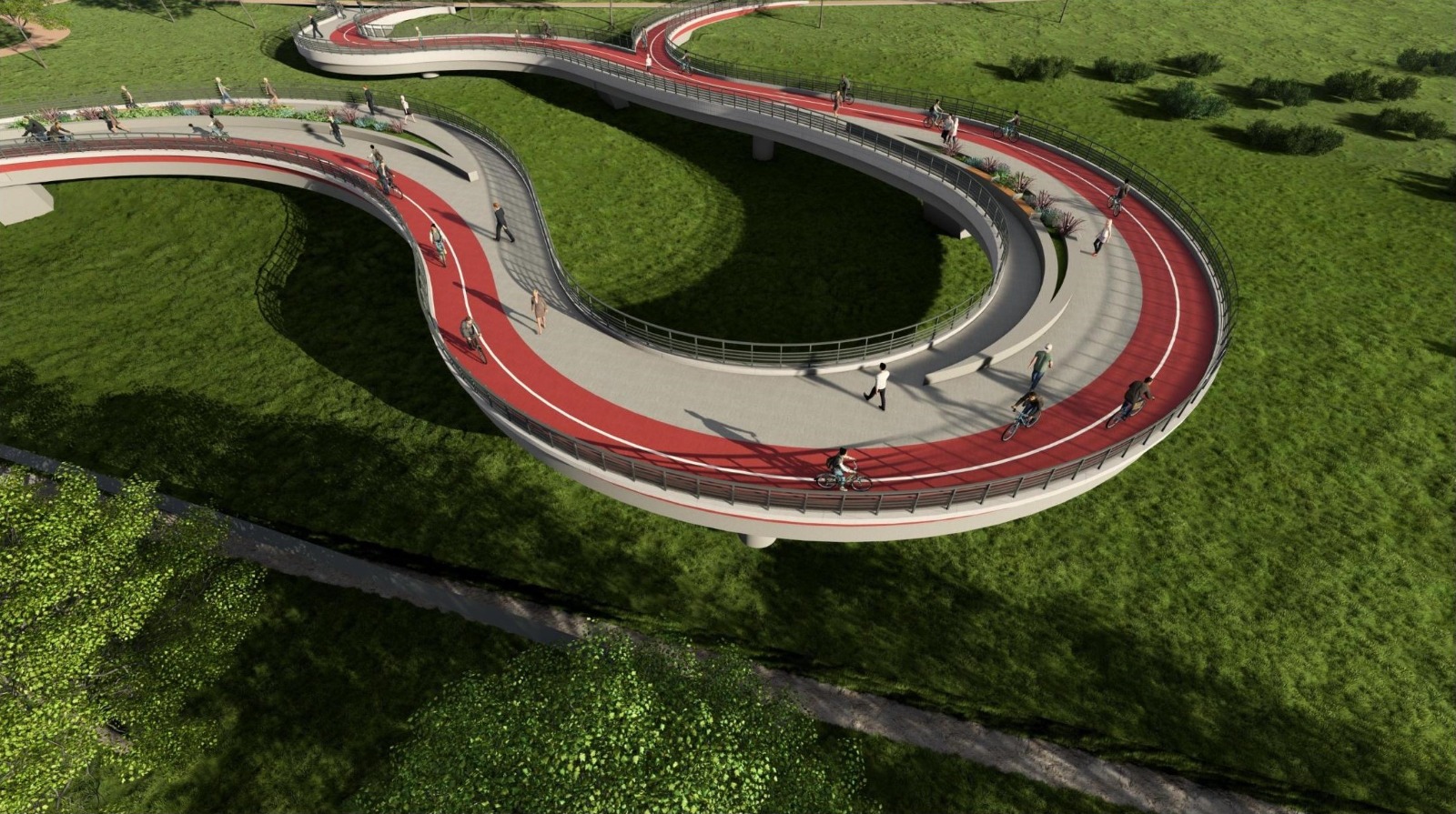 Proiectul prevede amenajarea unei pasarele cu grinzi metalice și dale din beton armat, zonă acoperită, jardiniere, iluminat pietonal și arhitectural.