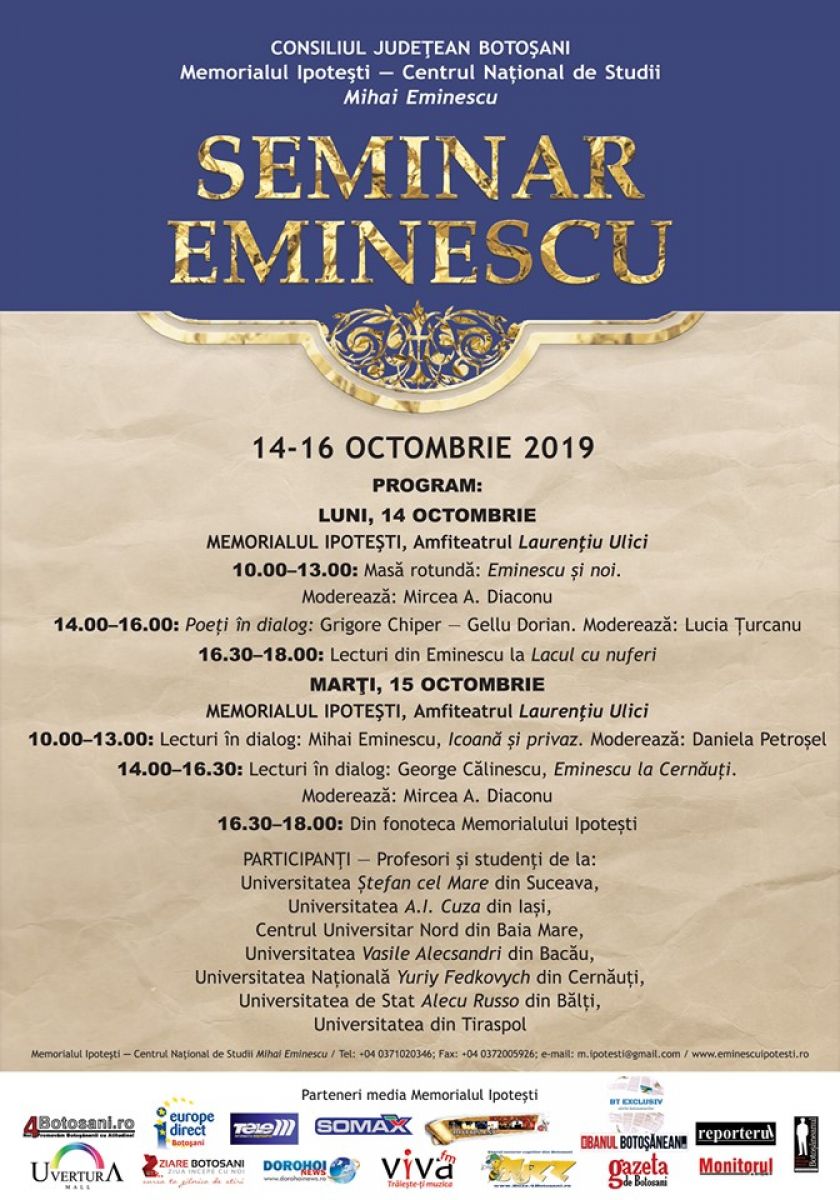 Memorialul Ipotești - Centrul Național de Studii Mihai Eminescu organizează, în perioada 14-15 octombrie 2019, a V-a ediție a Seminarului Eminescu. Gândit, inițial, ca un cadru de discuții pe teme de creație eminesciană pentru profesori și studenți din Cernăuți, Republica Moldova și Universitatea „Ștefan cel Mare” din Suceava, Seminarul și-a extins cu fiecare an arealul, anul acesta adunând studenți de la Universitatea „Al. I. Cuza” din Iași, Universitatea „Vasile Alecsandri” din Bacău, Universitatea „Ștefan cel Mare” din Suceava, Centrul Universitar Nord din Baia Mare, Universitatea de Stat „Alecu Russo” din Bălți, Universitatea din Tiraspol cu sediul la Chișinău, Universitatea Națională „Yuriy Fedkovych” din Cernăuți.