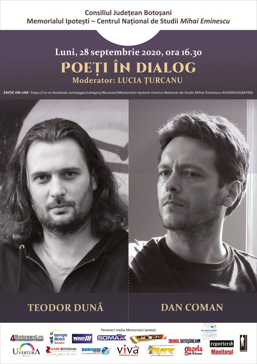 Pe data de 28 septembrie, la ora 16.30, Memorialul Ipotești – Centrul Național de Studii „Mihai Eminescu” organizează o ediție on-line a întâlnirilor Poeți în dialog. Invitații Memorialului sunt doi laureați ai Premiului Național de Poezie „Mihai Eminescu” – OPUS PRIMUM, poeții Teodor Dună și Dan Coman.