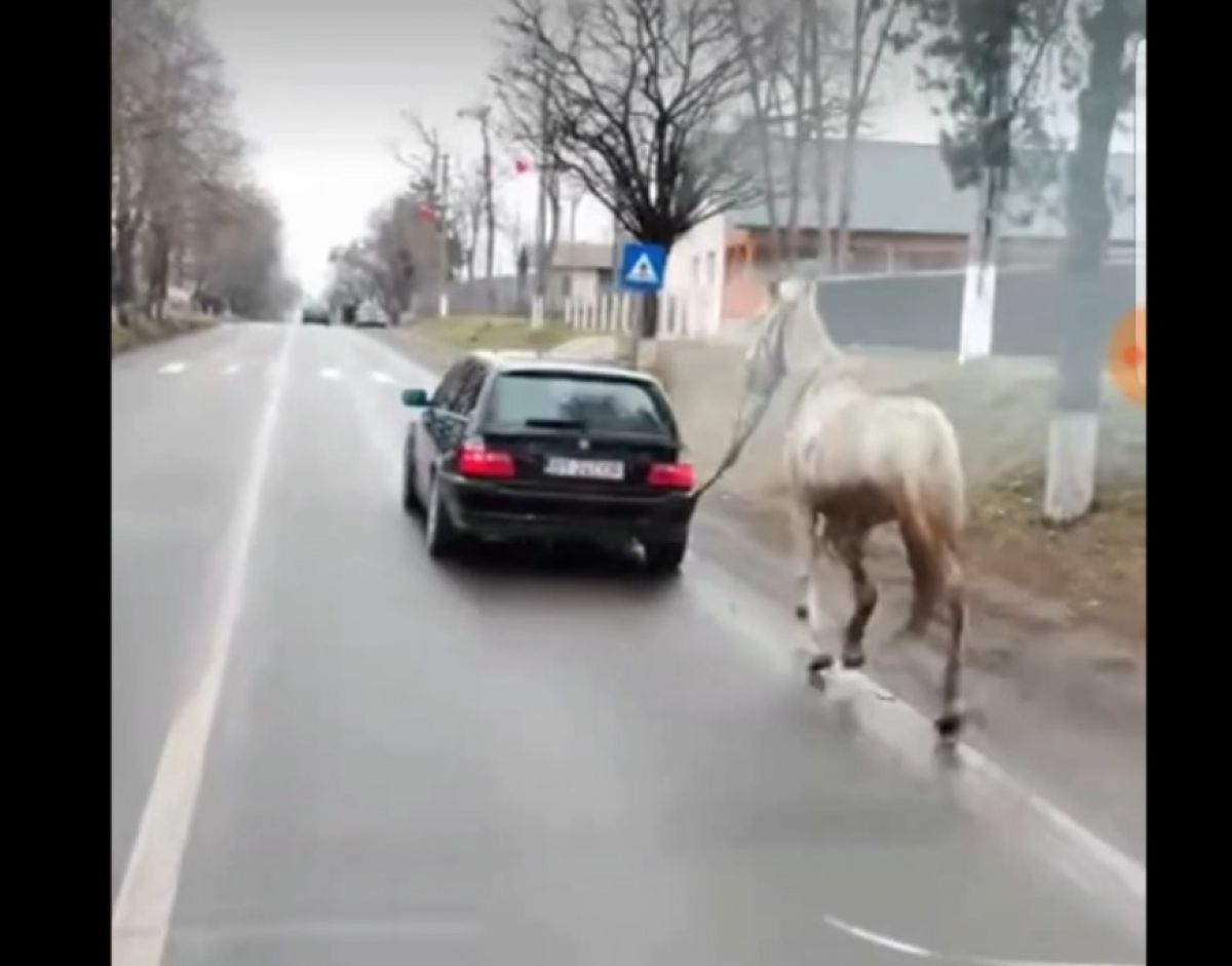 În clip este observat un autoturism marca BMW, model mai vechi de care este legat un cal care aleargă după mașină.