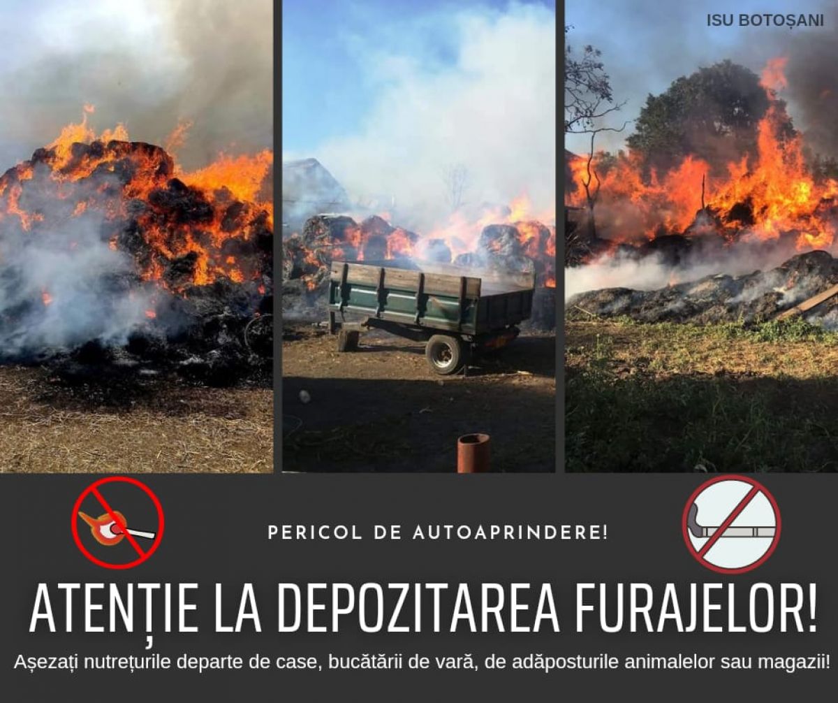 ”Fiind în plină campanie agricolă, precizăm faptul că furajele se pot autoaprinde dacă sunt depozitate înainte de a fi uscate sau în locuri ce nu sunt ventilate corespunzător.De asemenea, prin natura lor combustibilă, acestea se aprind foarte repede în prezenţa oricărei surse de foc”,