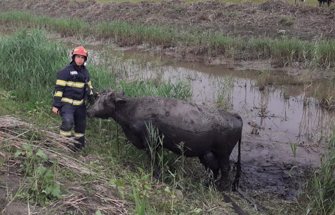 Salvatorii au reușit să lege bovina cu chingi speciale și, cu ajutorul unui buldoexcavator, au reușit să o aducă în siguranță pe mal.
