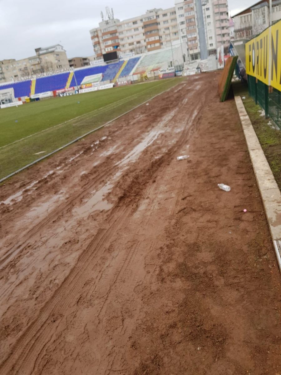 Așa arată pista de alergare de pe Stadionul Municipal. Cine se încumetă să înoate prin noroaie?