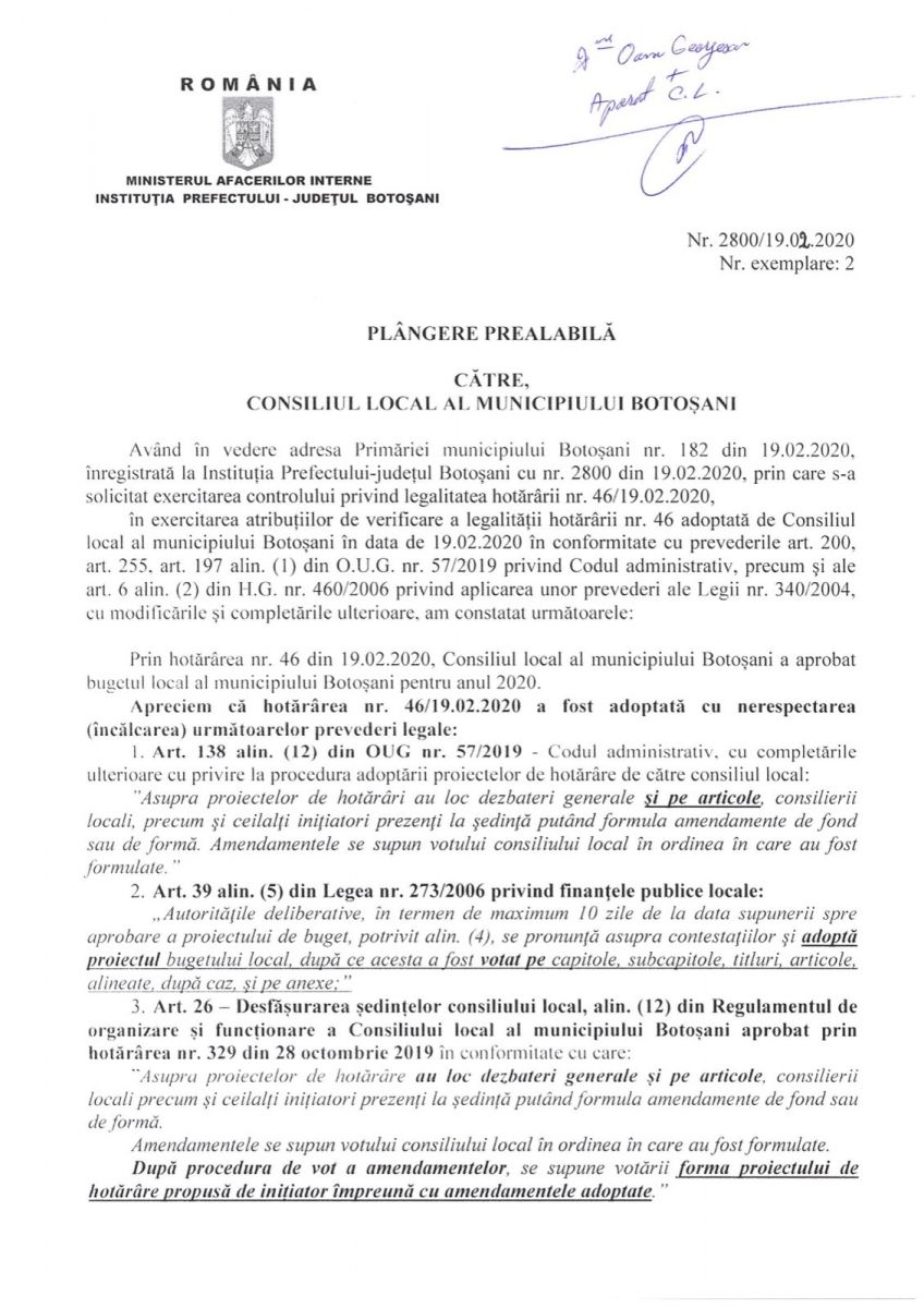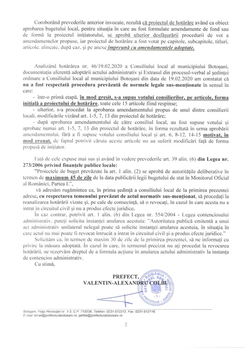 Hotărârea (HCL nr. 46/19.02.2020) a fost înaintată Instituției Prefectului Botoșani pentru obținerea cu celeritate a avizului de legalitate, în condițiile în care mâine, 20 februarie, expiră termenul legal de 45 de zile în care trebuie adoptat bugetul municipiului.