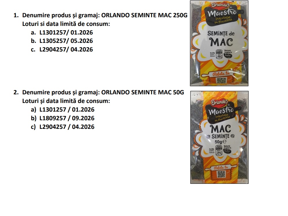 PROFI acordă prioritate siguranței alimentare, motiv pentru vă informează că furnizorul ORLANDO IMPORT-EXPORT 2001 a inițiat retragerea de la comercializare şi rechemarea de la client a produselor menționate mai jos, ca urmare a depăsirii limitei legale admise pentru parametrul Alcaloizi opiu.