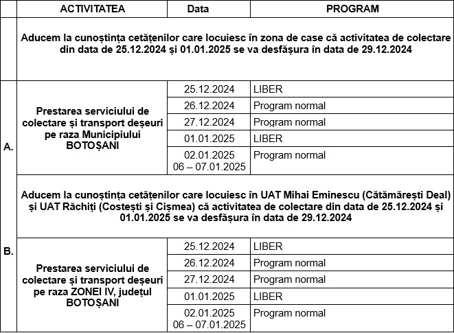 Compania de salubrizare aflată în subordinea municipalității va lucra după un program special în perioada sărbătorilor de iarnă.
