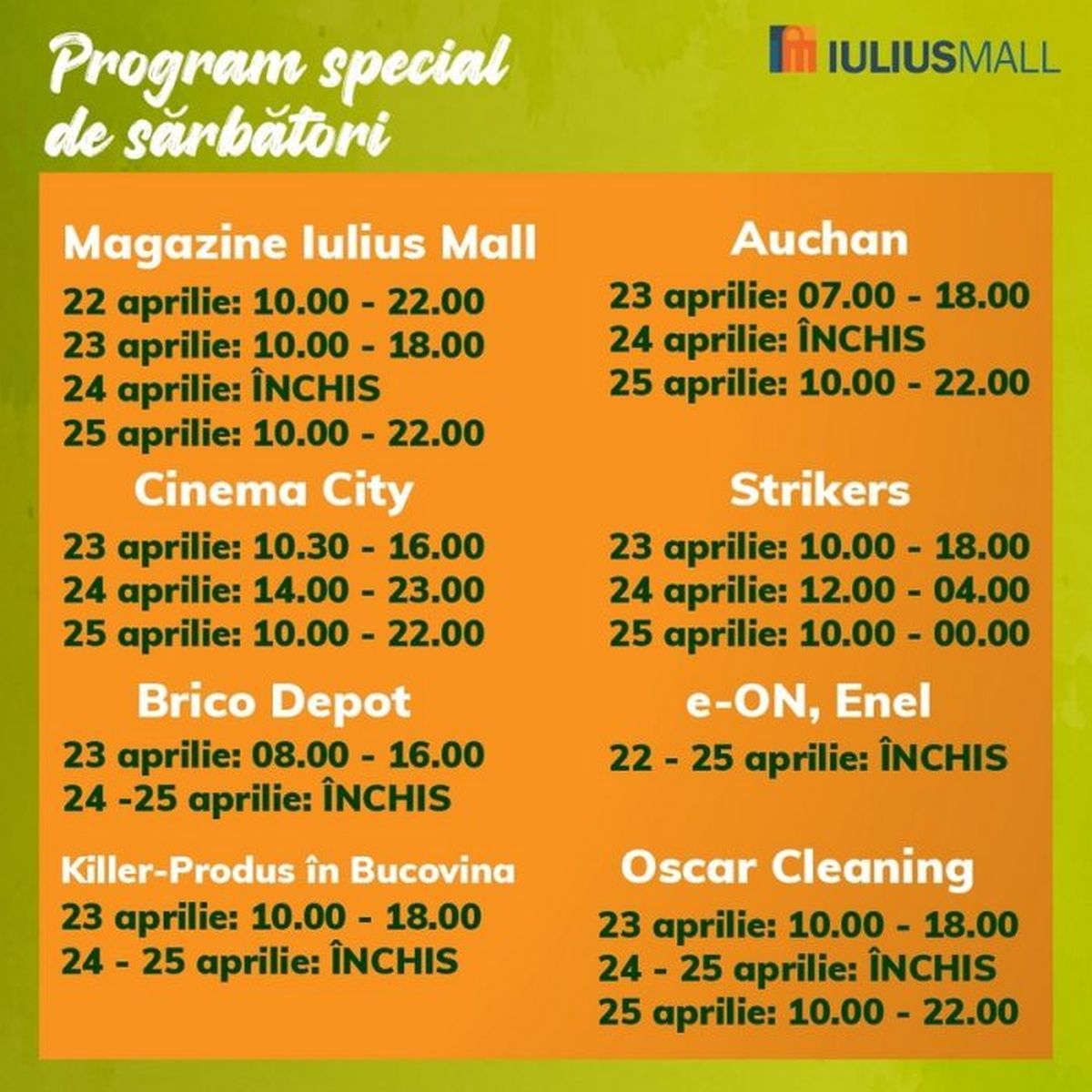 În prima zi de Paște, atât magazinele din Iulius Mall Suceava, cât și hypermarketul Auchan vor fi închise. Programul special de sărbători poate fi consultat pe paginile de Facebook ale fiecărei locații.