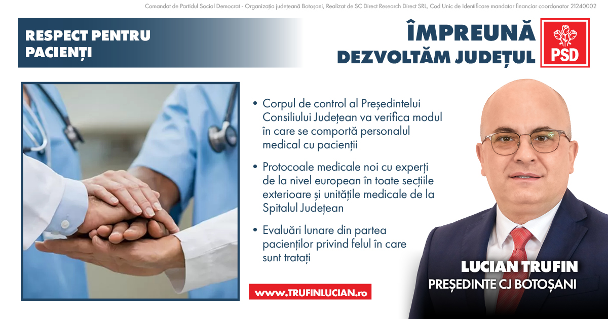 Candidatul PSD pentru funcția de președinte al Consiliului Județean Botoșani, Lucian Trufin afirmă că programul său „RESPECT PENTRU PACIENȚI” va asigura implementarea celor mai riguroase proceduri și protocoale medicale pentru tot personalul sanitar și auxiliar de la toate unitățile spitalicești coordonate de către Consiliul Județean Botoșani.
