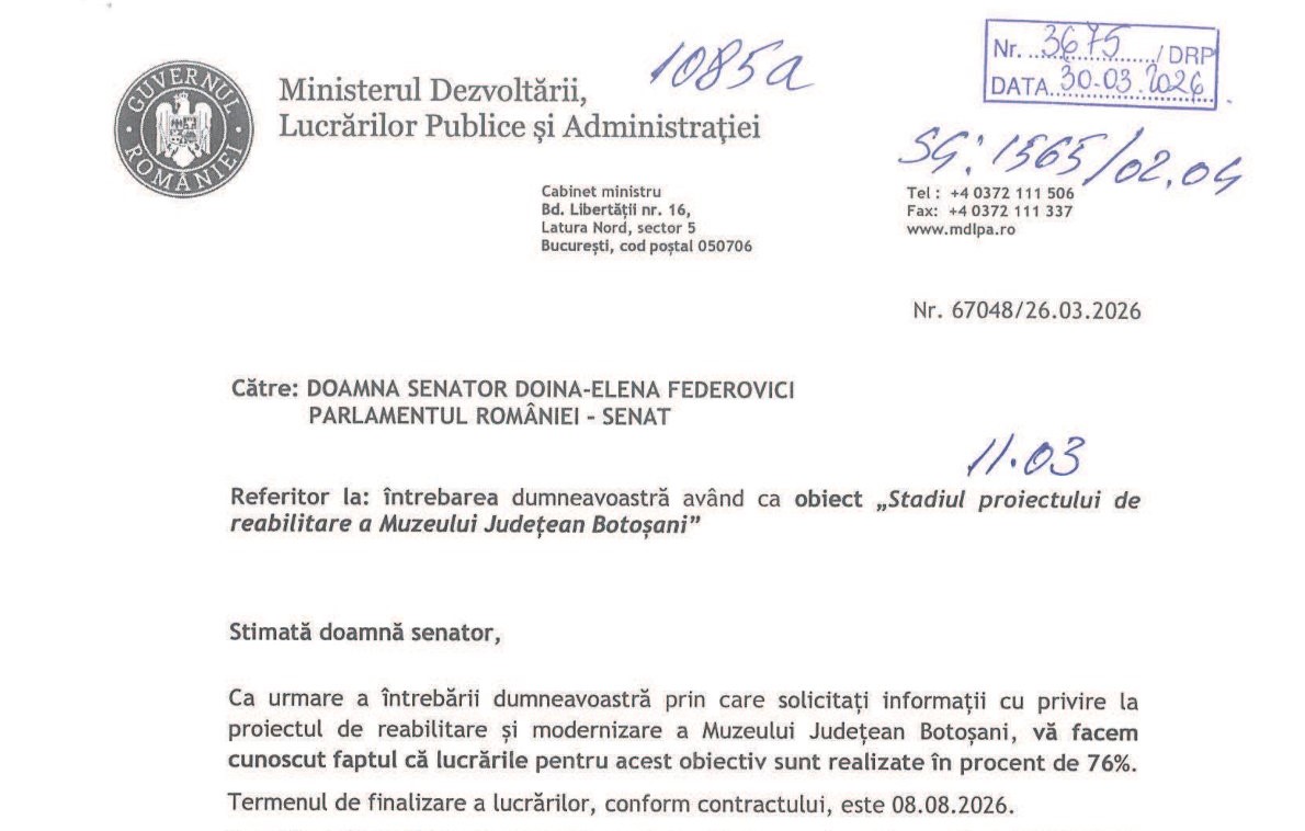 Reabilitarea Muzeului Județean de Istorie Botoșani trebuia să fie finalizată deja, dar lucrările sunt în întârziere. Ministerul Dezvoltării, Lucrărilor Publice și Administrației recunoaște oficial, în răspunsul la interpelarea senatorului PSD Doina Federovici, o întârziere de șase luni. În realitate, situația ar putea fi mult mai gravă.
