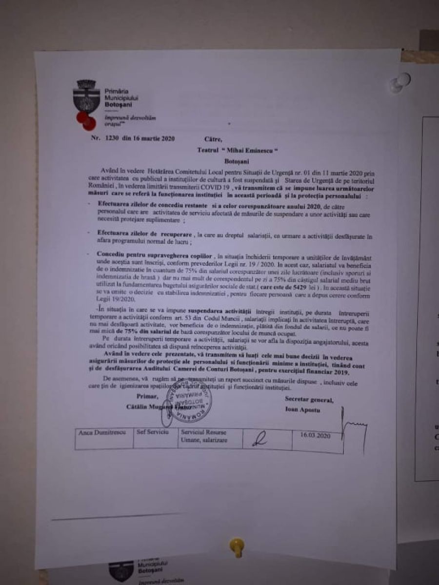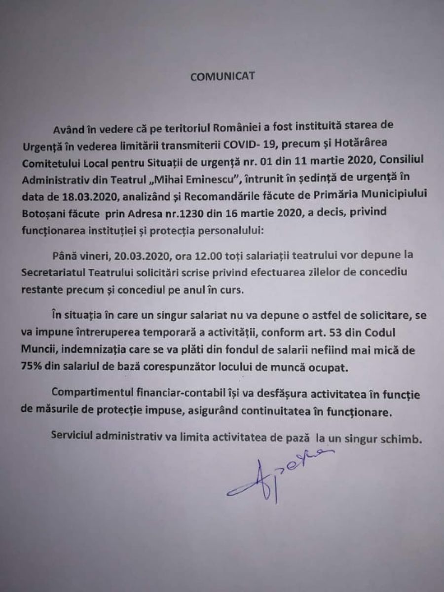 Urmare a acestei adrese, Traian Apetrei, directorul Teatrul ”Mihai Eminescu” Botoșani, susține că a solicitat tuturor salariaților să decidă până vineri, 20 martie 2020, ora 12:00, soluția pentru care optează pe perioada suspendării, respectiv concediul de odihnă (care oricum este plătit conform legii) sau indemnizație de 75%, în caz de nedepunere a cererii mergându-se automat pe varianta a doua.