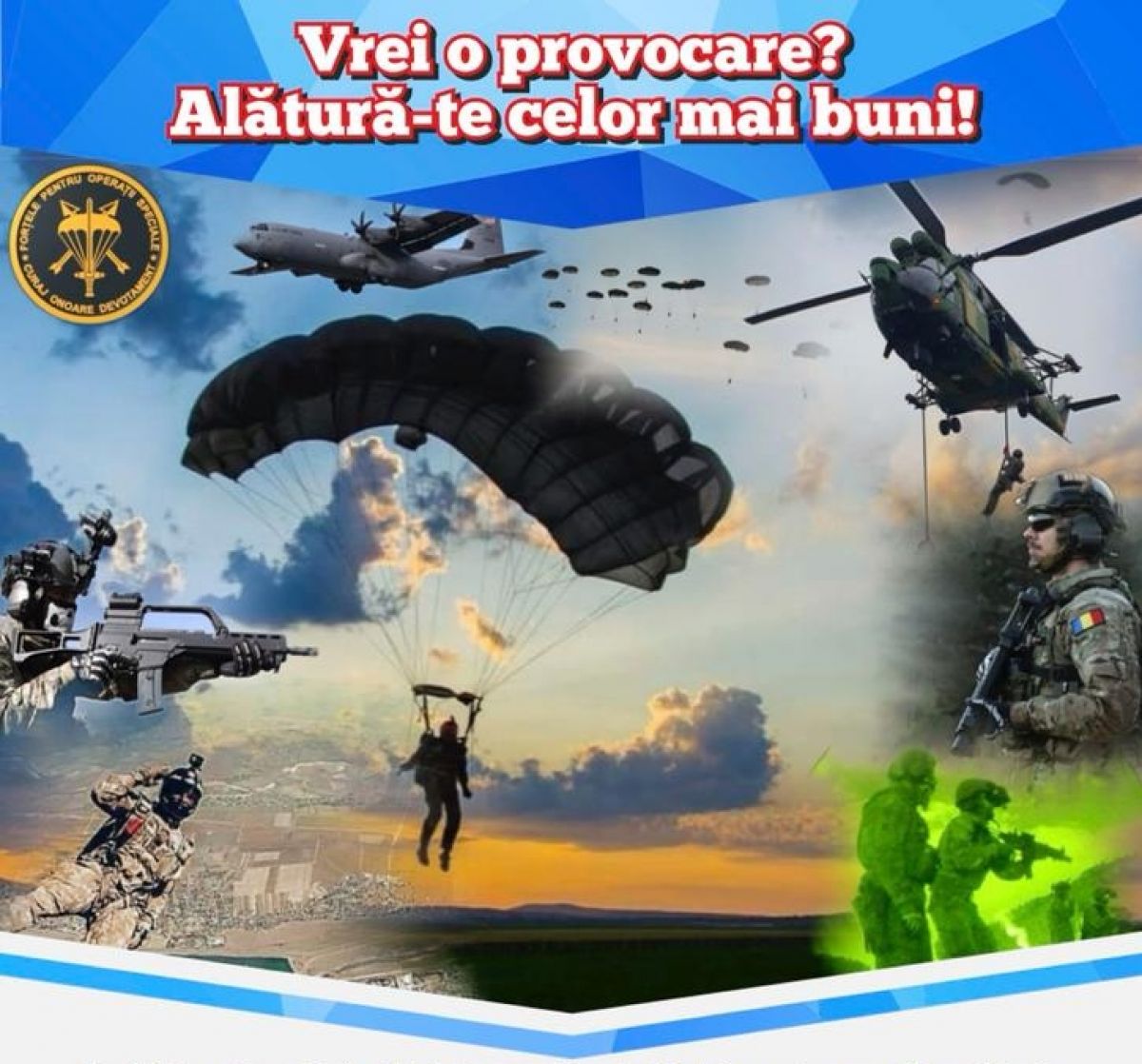 Dacă îți dorești o carieră militară de succes în cadrul Forțelor pentru Operații Speciale ale Armatei României, Batalionul 53 Comando ”Smaranda Brăescu”, alături de Școala de Instruire a Forțelor pentru Operații Speciale ”Burebista”, organizează recrutarea cetățenilor români cu aptitudini pentru încadrarea cu personal a posturilor de soldați și gradați profesioniști, precum și subofițerilor pe filiera indirectă, în specialitatea parașutiști comando.