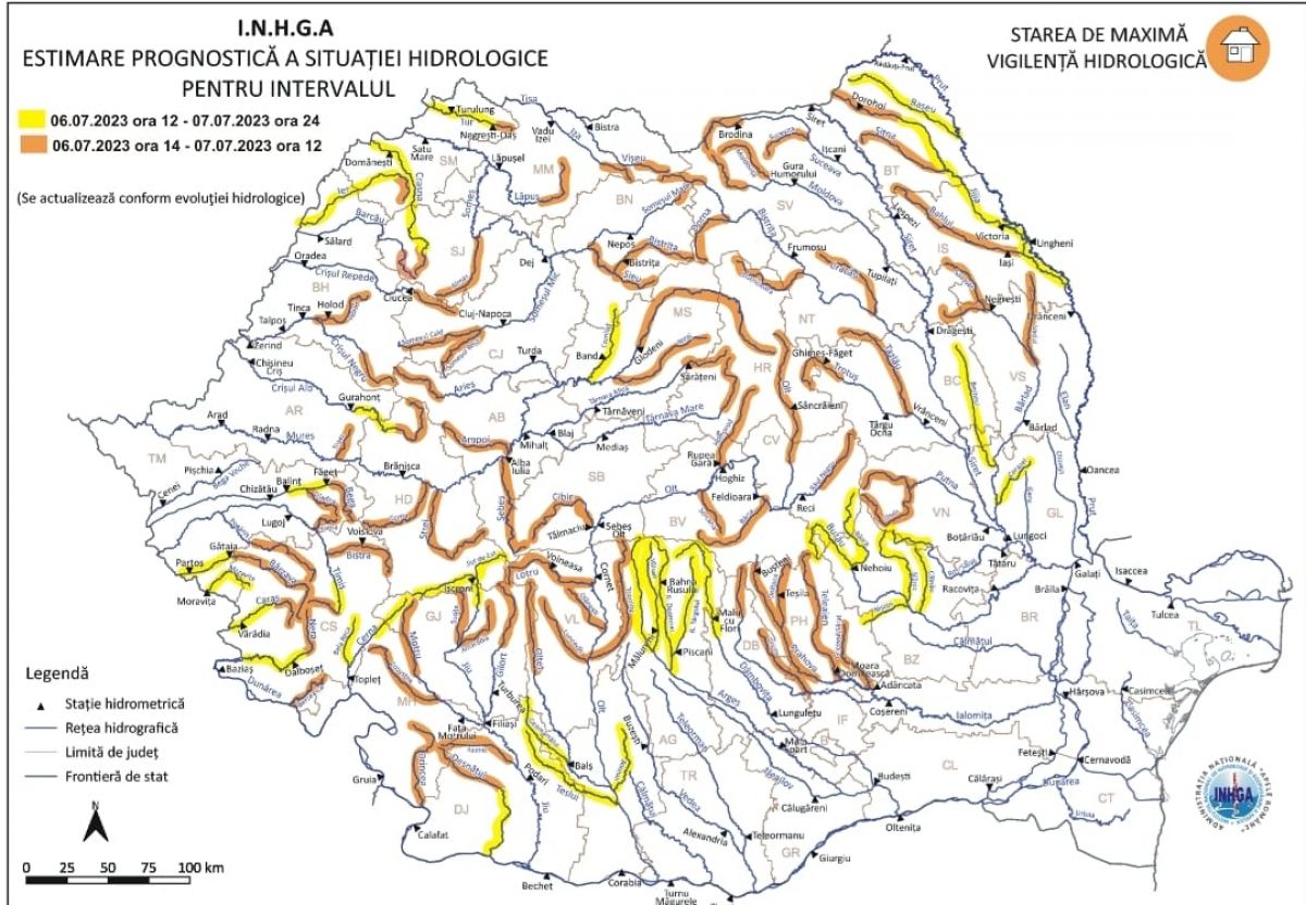• Cod Portocaliu, de la 6 iulie 2023, începând cu ora 14:00 14:00, până la 7 iulie 2023, ora 12:00, pe râul Jijia și afluenții acestuia;