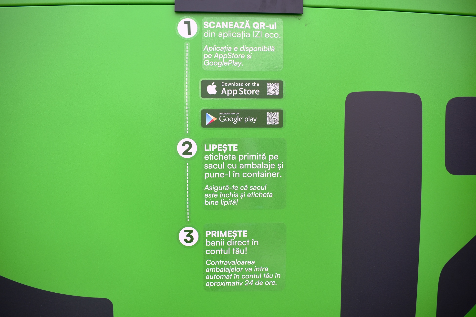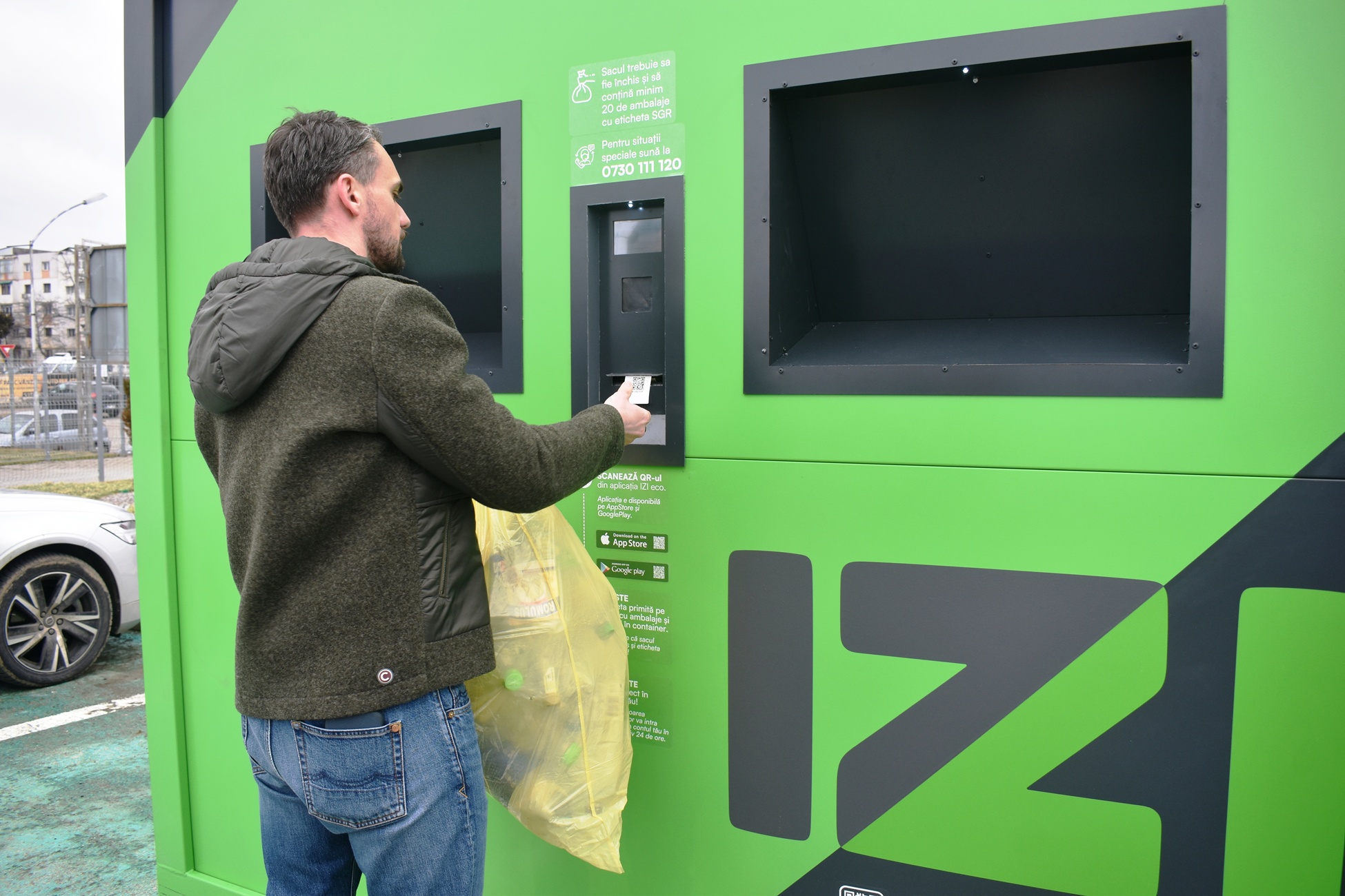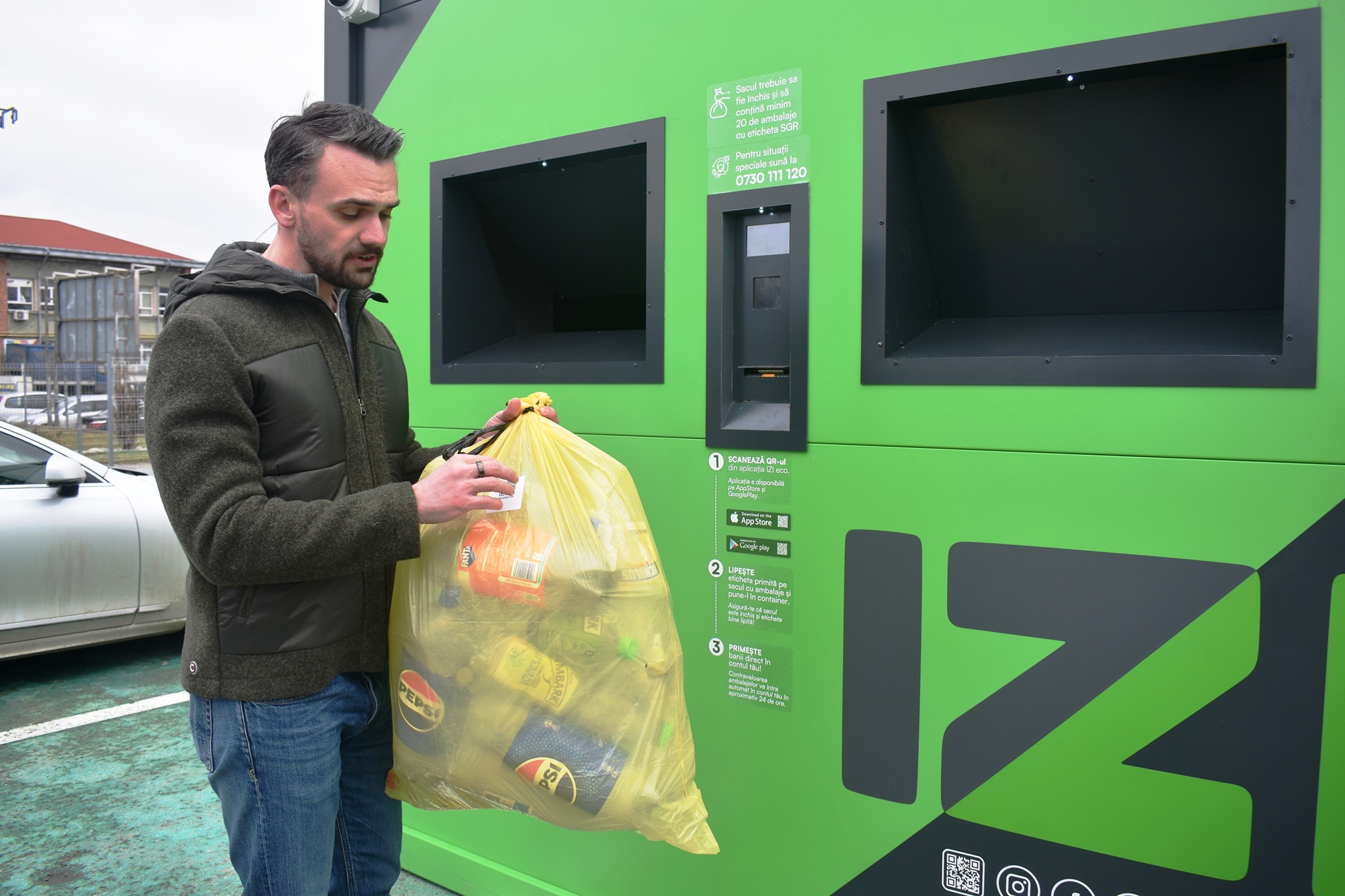 ”Diferența la IZI față de sistemele clasice este că se poate returna un sac întreg de ambalaje SGR într-un timp de sub un minut. Clienții nu mai trebuie să vină la aparatele clasice și să introducă ambalajele manual, unul câte unul, ci strâng un sac de ambalaje SGR, minim 20, își descarcă o singură dată aplicația IZI ECO, se uită pe aplicație, în hartă, și vor găsi locația lockerelor. Vin cu sacii de ambalaje la lockerele noastre IZI, își scanează codul QR, îl lipesc pe sac, depun sacul în IZI și banii intră pe card în aproximativ 24 de ore în contul indicat, pe care l-au pus în aplicație”.