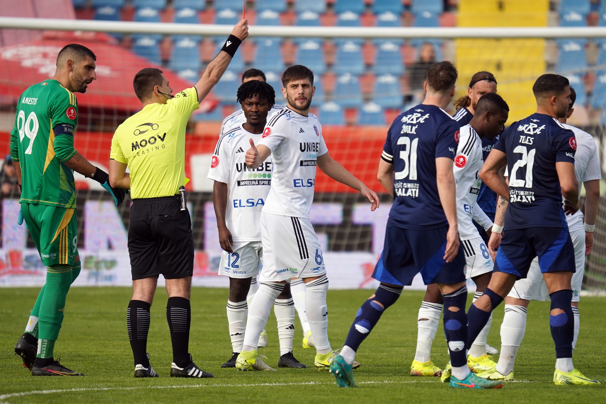 Aldair l-a faultat pe Teles de la Oțelul Galați, iar după analiza la punctul cu VAR centralul i-a acordat cartonaș roșu jucătorului de la FC Botoșani.