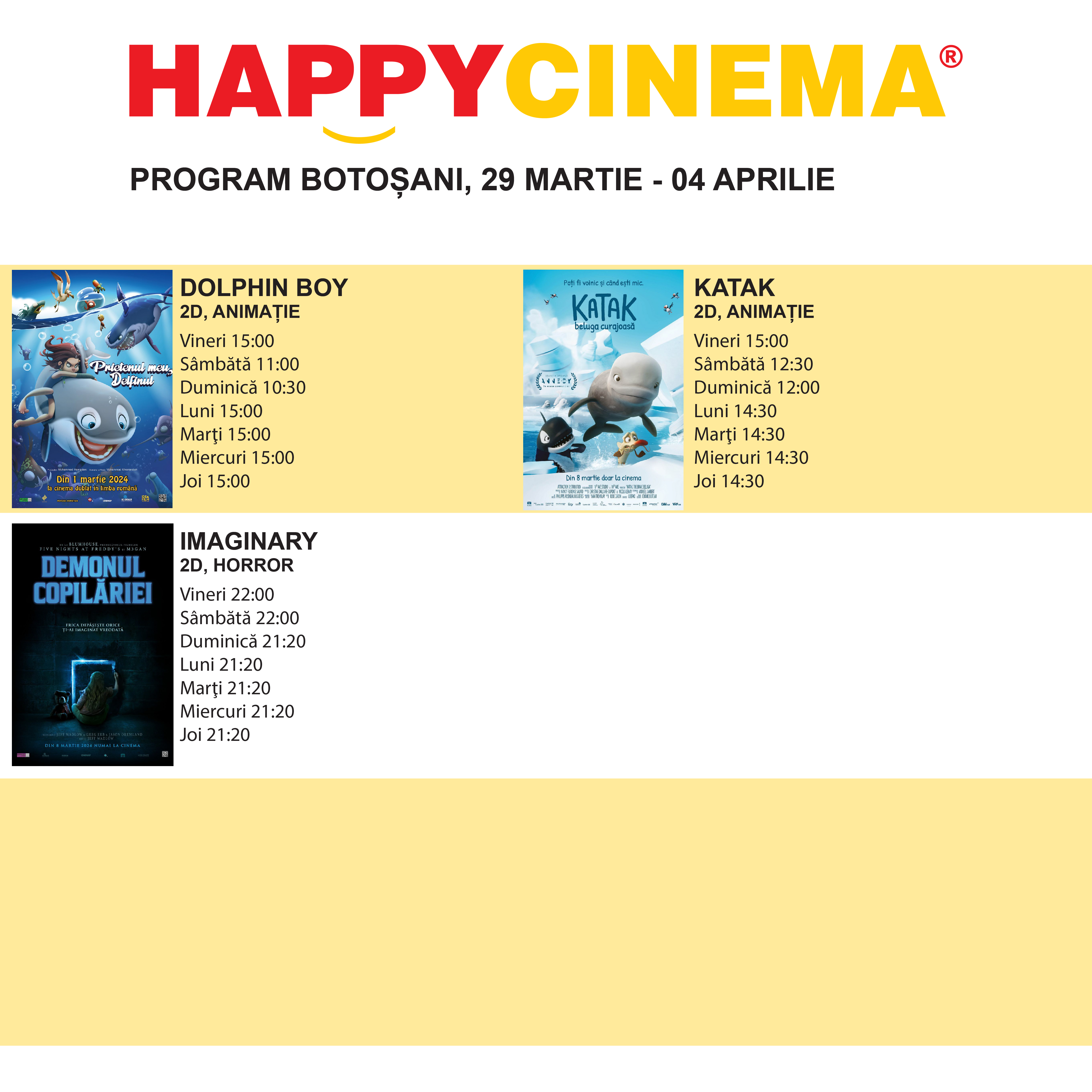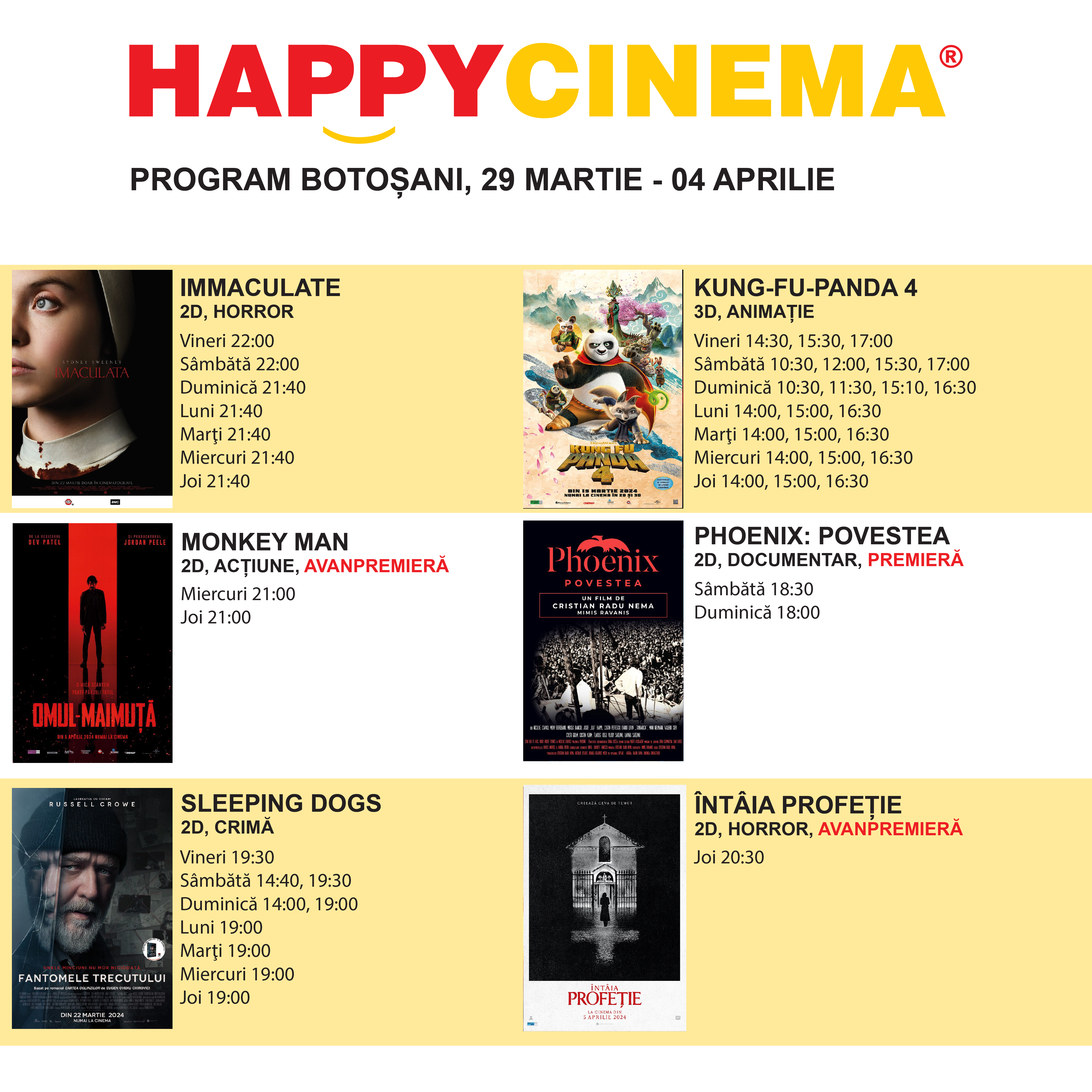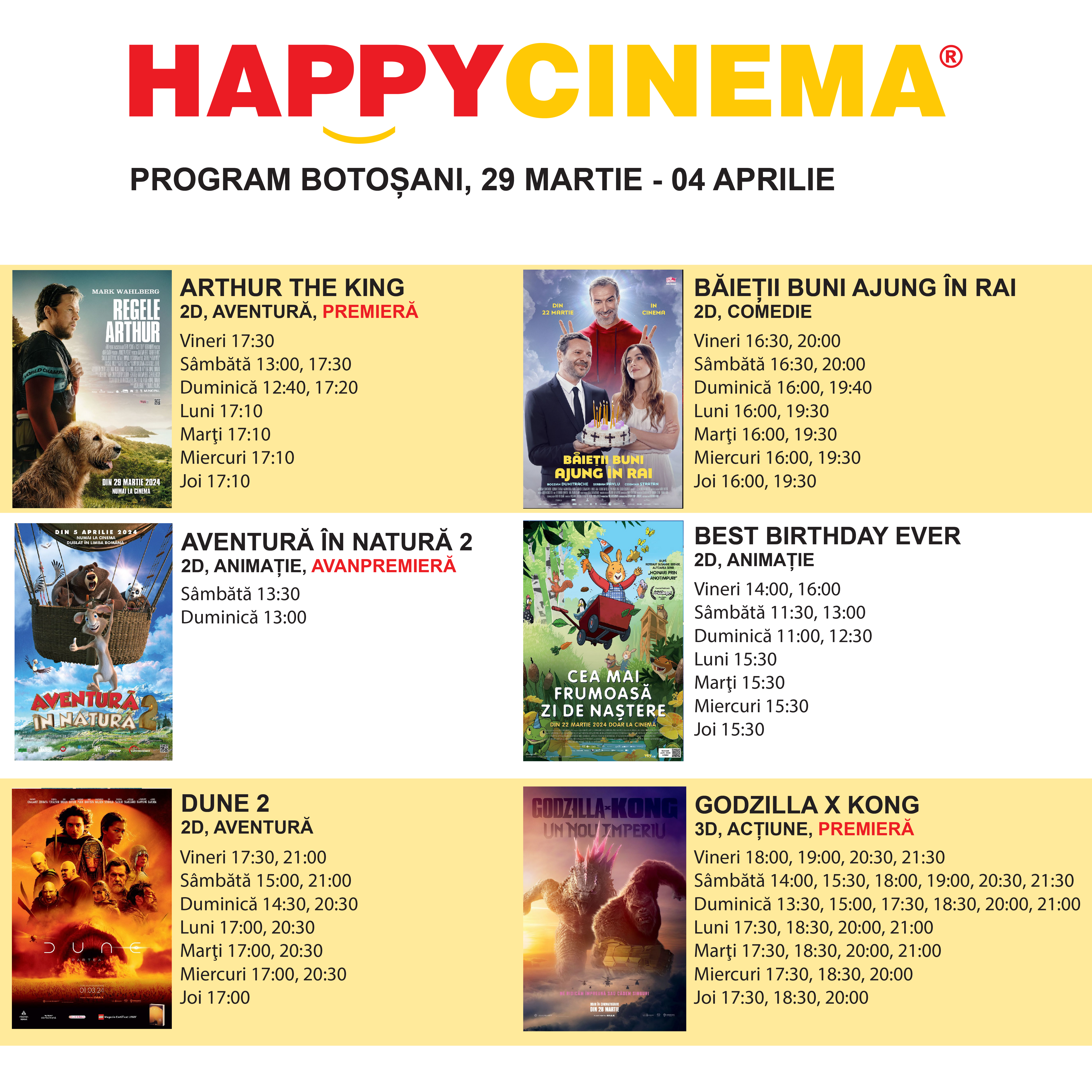 Happy Cinema Botoșani a transmis programul pentru săptămâna 29 martie -4 aprilie 2024.
