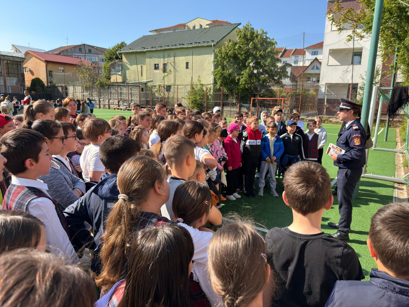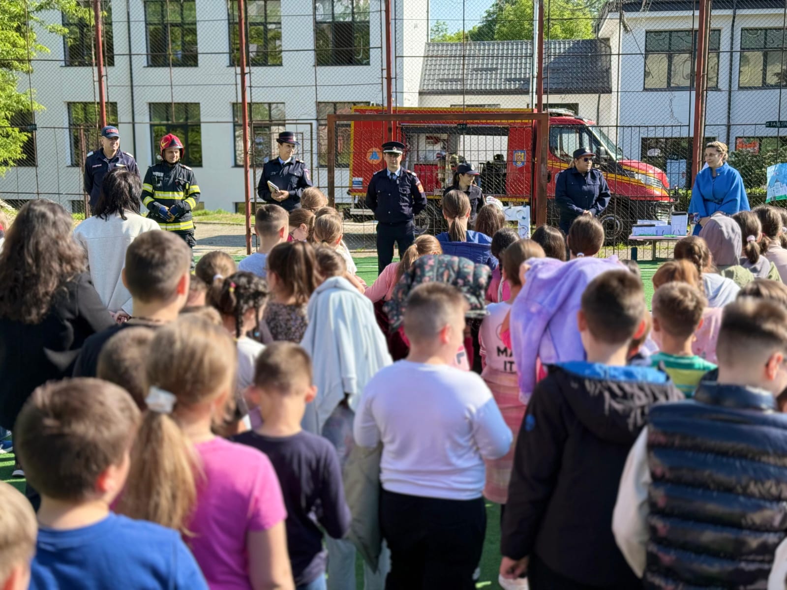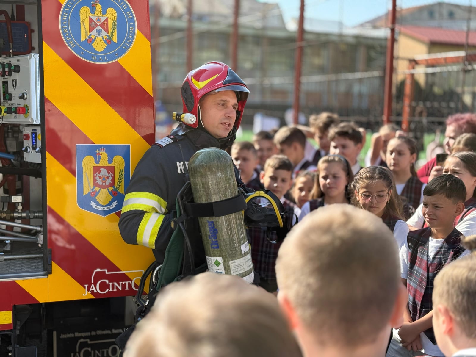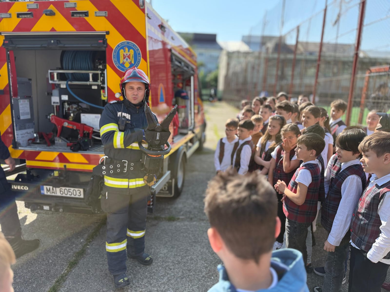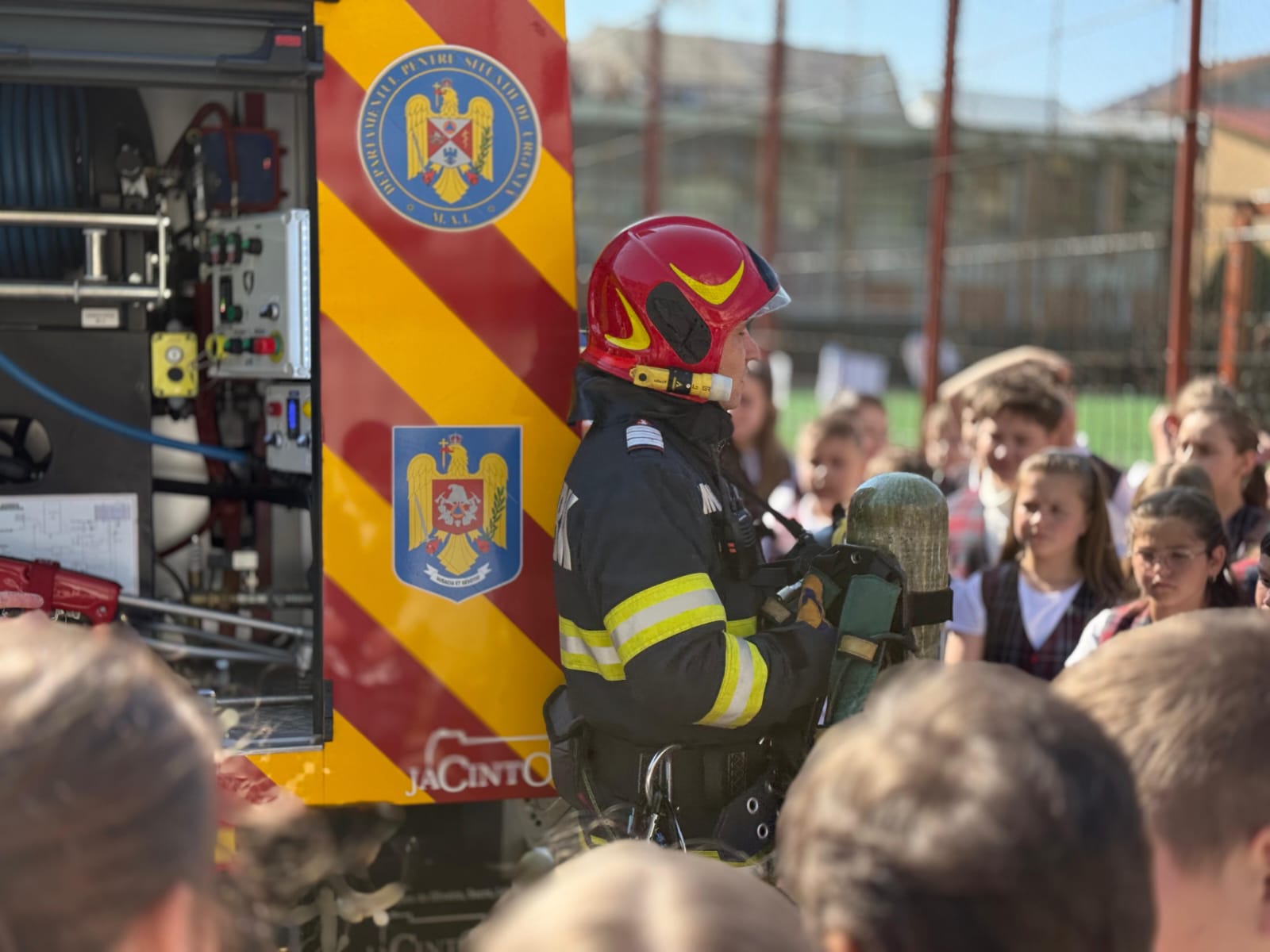 Unul dintre cele mai așteptate momente a fost prezentarea autospecialei de stingere. Elevii au descoperit accesoriile folosite în misiunile de salvare și au probat echipamentele de protecție folosite de pompieri.