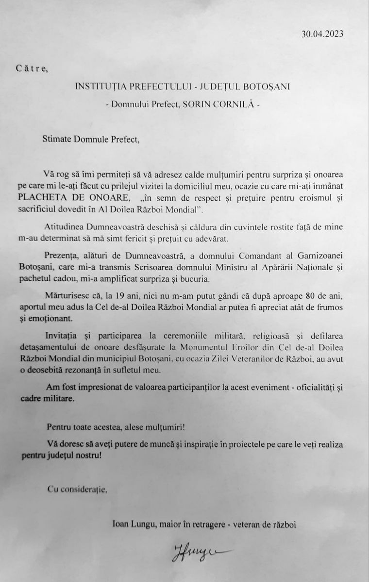 Vă rog să îmi permiteți să vă adresez calde mulțumiri pentru surpriza și onoarea pe care mi le-ați făcut cu prilejul vizitei la domiciliul meu, ocazie cu care mi-ați înmânat PLACHETA DE ONOARE, ”în semn de respect și prețuire pentru eroismul și sacrificiul dovedit în Al Doilea Război Mondial”.