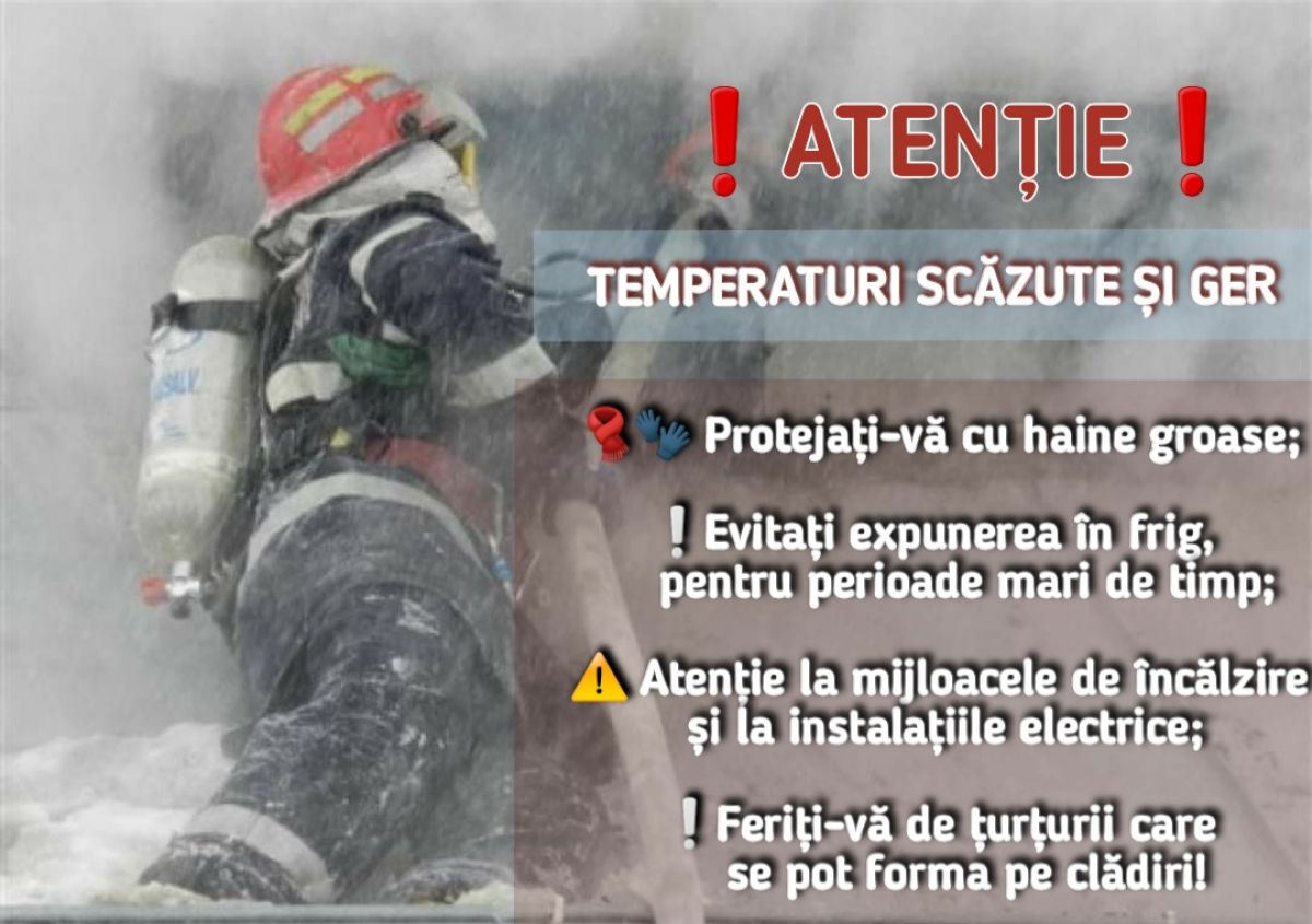 Având în vedere temperaturile scăzute prognozate pentru următoarea perioadă, mai ales pe timpul nopții, vă recomandăm să acordați o atenţie deosebită măsurilor de siguranţă în propriile locuinţe, dar şi la locul de muncă, pentru a se evita pierderile de vieţi omeneşti, dar şi de bunuri materiale.