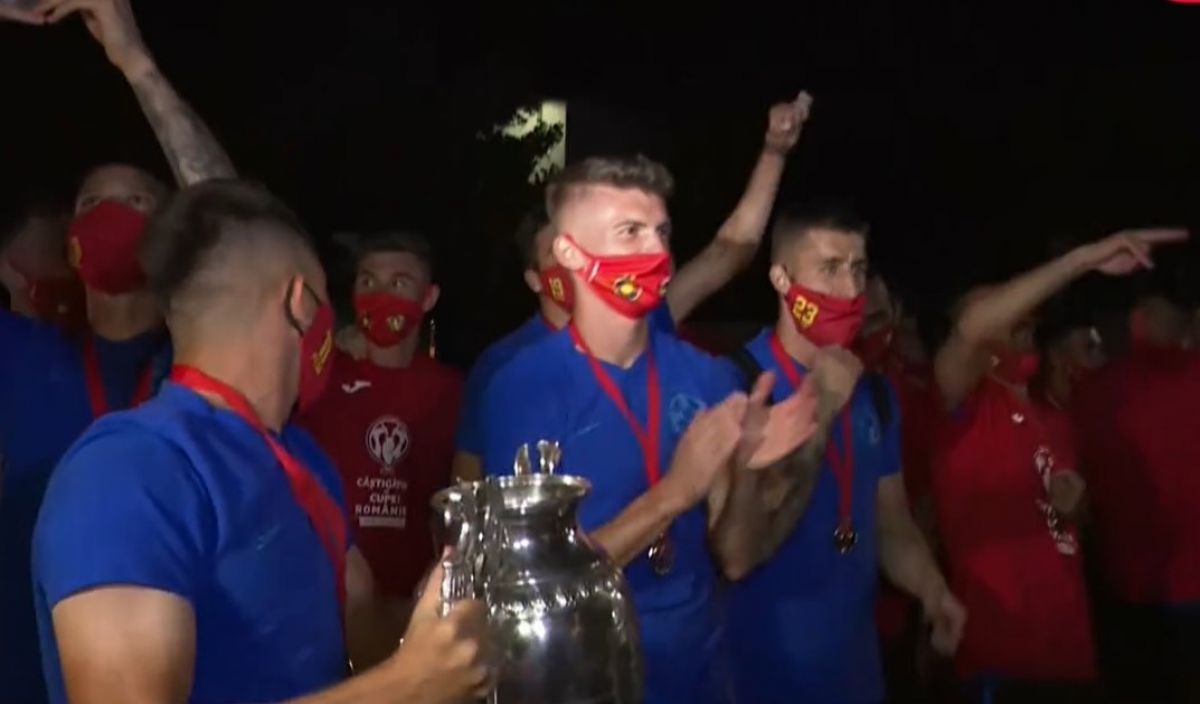 FCSB a câștigat Cupa României, după ce a învins-o în finală pe Sepsi, scor 1-0. După meci, roș-albaștrii au sărbătorit alături de câteva sute de fani la baza echipei din Berceni;