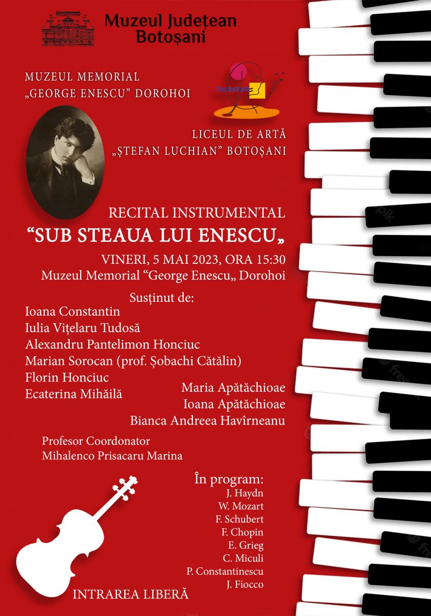 Muzeul Județean Botoșani organizează vineri, 5 mai 2023, începând cu ora 15.30, în Sala Polivalentă a Muzeului Memorial „George Enescu” Dorohoi, recitalul instrumental „Sub steaua lui Enescu”.