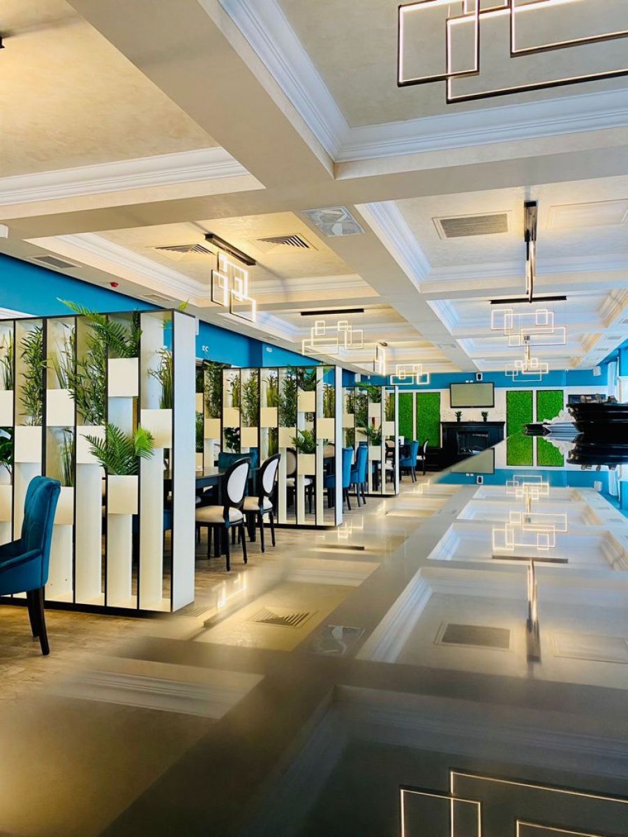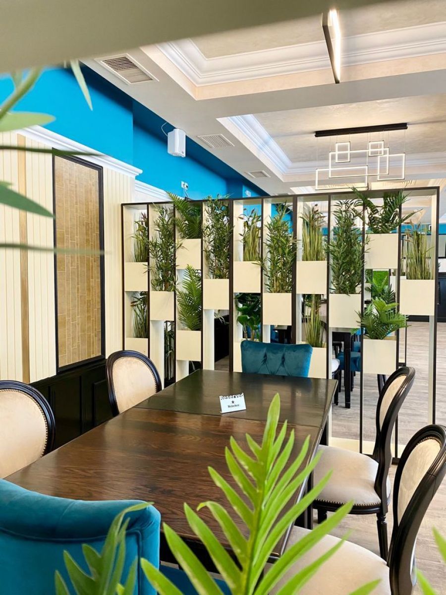 Și aceasta pentru că design-ul este unul modern, revoluționar chiar pe alocuri, în care mesele sunt flancate de aranjamente florale dispuse pe verticală, iar pe pereți au fost dispuși arbuști.