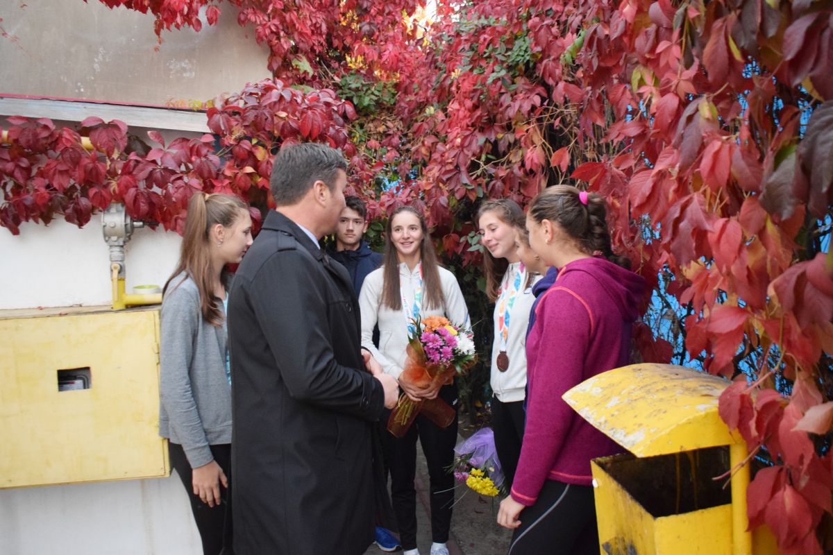 Tabita şi Alina au fost aşteptate la gară, unde au primit buchete de flori şi au fost felicitate de Dan Şlincu pentru performanţa obţinută în concurs, medalia de bronz, la finalul unei curse atipice- parcurgerea unei distanţe de 500 de metri în viteză într-un echipaj de două rame.