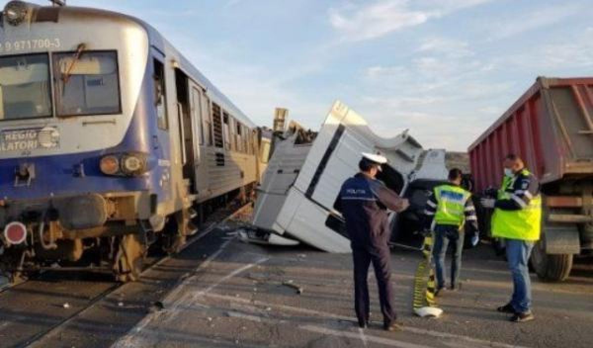 Un tren a lovit un camion şi a deraiat. Din primele informaţii, camionul a făcut dreapta peste calea ferată, fără ca şoferul să observe semnalele luminoase.