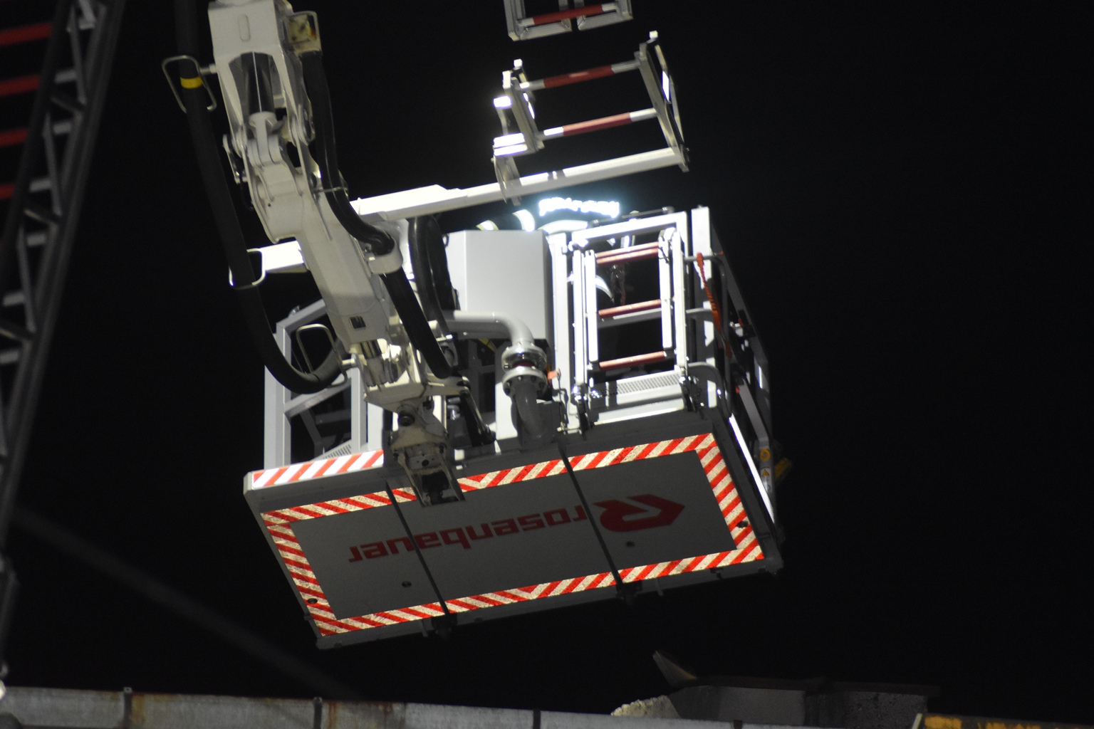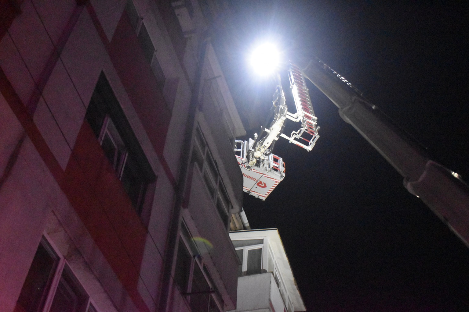 Un pompier a fost ridicat deasupra blocului și a îndepărtat mai multe elemente de construcție.