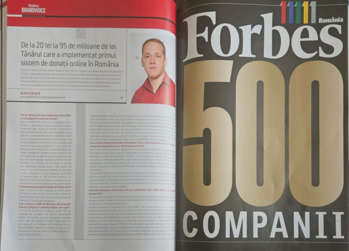 „Am plăcerea de a vă anunța că începând de azi, la toate magazinele de ziare și punctele Inmedio, puteți achiziționa ediția specială Forbes 500. În această ediție, redacția revistei Forbes a inclus un interviu exclusiv dedicat parcursului remarcabil al Asociației "Salvează o Inimă", ilustrând evoluția noastră impresionantă de la umilele începuturi cu 20 de lei, până la un buget de 95 de milioane de lei.