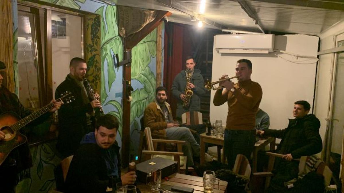 Folosind instrumentele expuse în bar și pe cele pe care studiază, trupa încropită pe loc și condusă de Eduard Sandu, la trompetă, a pus lumea pe jar, scrie știridecluj.ro.