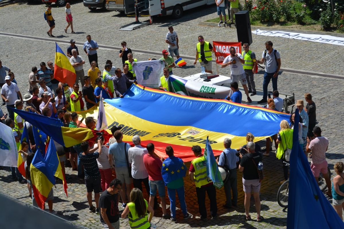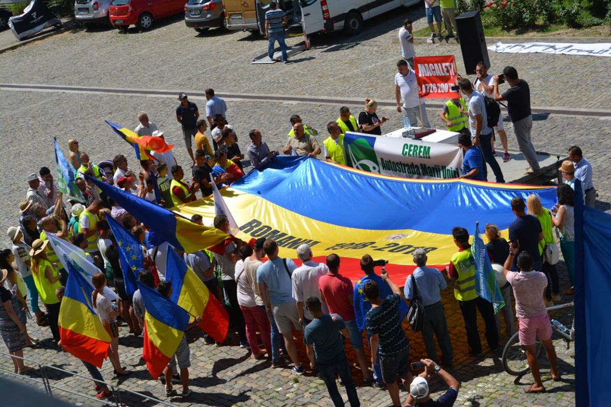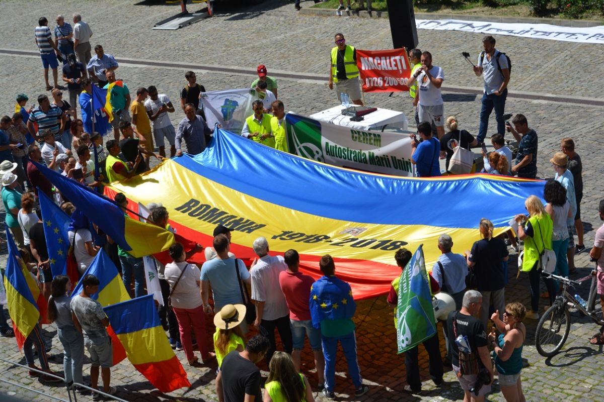 Zeci de protestatari s-au strâns în jurul unui tricolor imens și au trimis câte un SMS în același timp șefului CJ, care prin Direcția Județeană de Drumuri și Poduri răspunde de rețeaua de drumuri de rang județean.