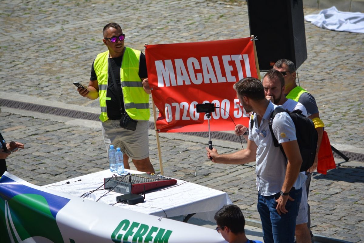Astfel, după aproximativ o oră de demonstrații în Piața Revoluției, inițiatorii manifestării au scos un banner pe care era scris numărul de telefon al lui Costică Macaleți.