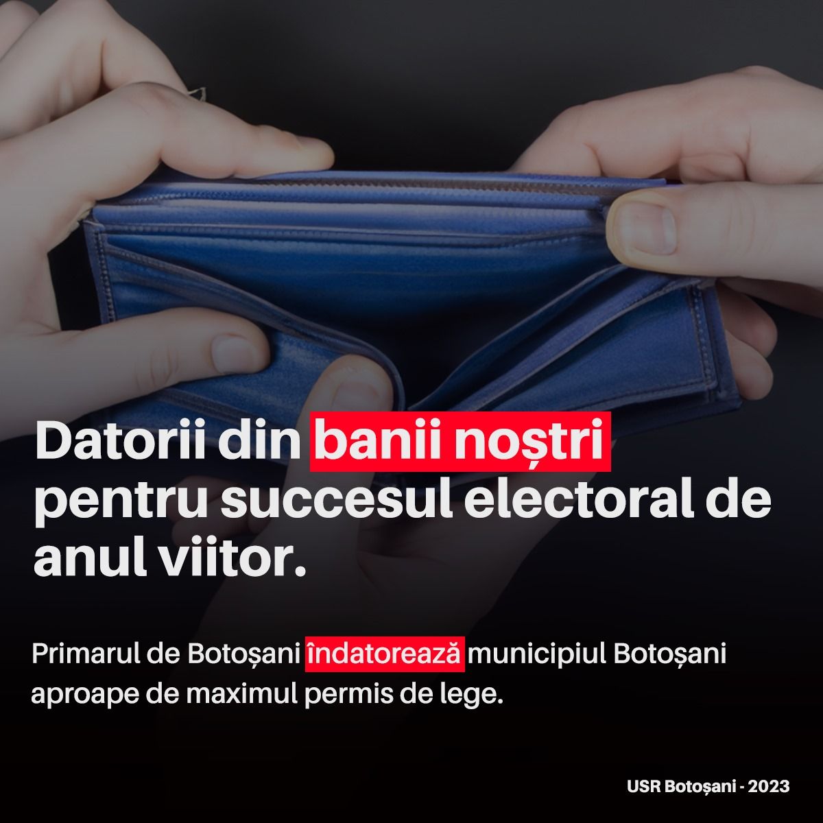 USR Botoșani atrage atenția că Botoșaniul se împrumută pe bani publici și din cauza incompetenței și delăsării celor ce gospodăresc acest municipiu. Practic primarul Cosmin Andrei vrea să dubleze bugetul de investiții al municipiului, în condițiile în care e incapabil să cheltuie banii bugetați pe 2023.