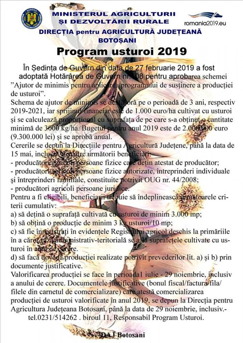 Valorificarea producției se face în perioada1 iulie - 29 noiembrie, inclusiv a anului de cerere. Documentele justificative (bonul fiscal/factura/fila/filele din carnetul de comercializare) care atestă comercializarea producției de usturoi valorificate în anul 2019, se depun la Direcția Agricolă Județeană Botoşani până la data de 29 noiembrie, inclusiv.