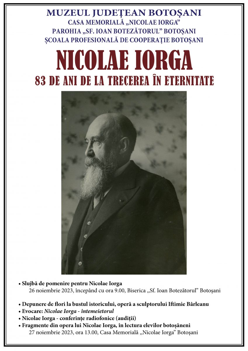 Muzeul Judeţean Botoşani organizează, în zilele de 26 şi 27 noiembrie 2023, comemorarea a 83 de ani de la trecerea în eternitate a lui Nicolae Iorga.