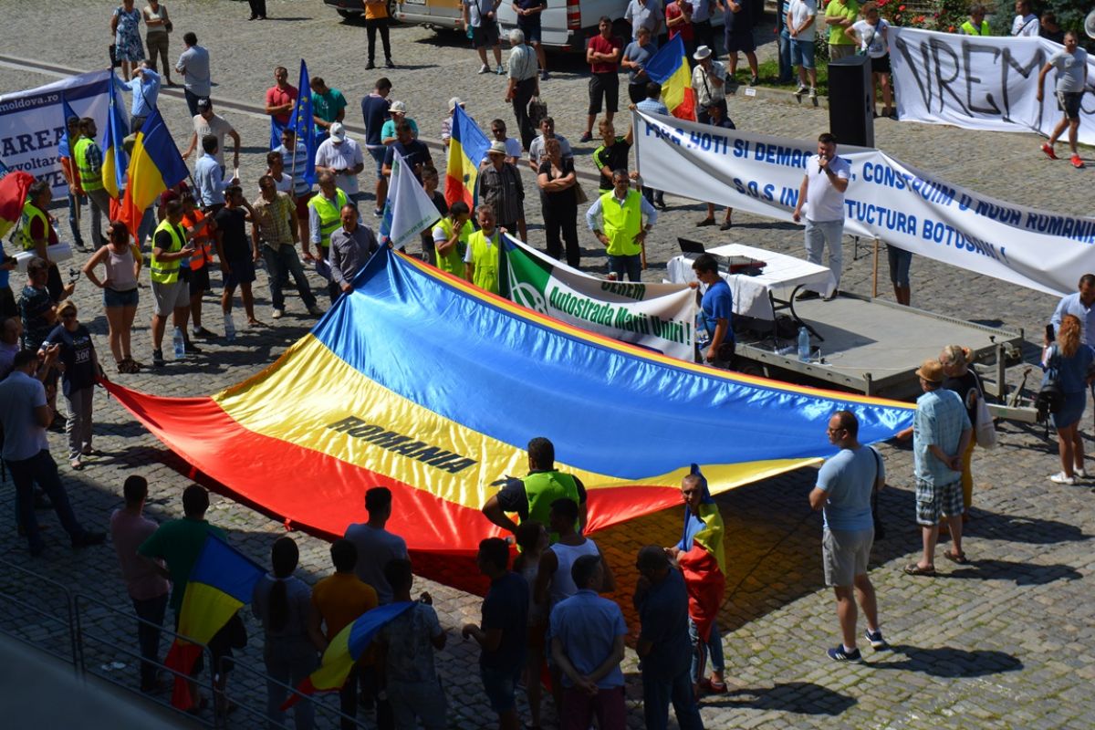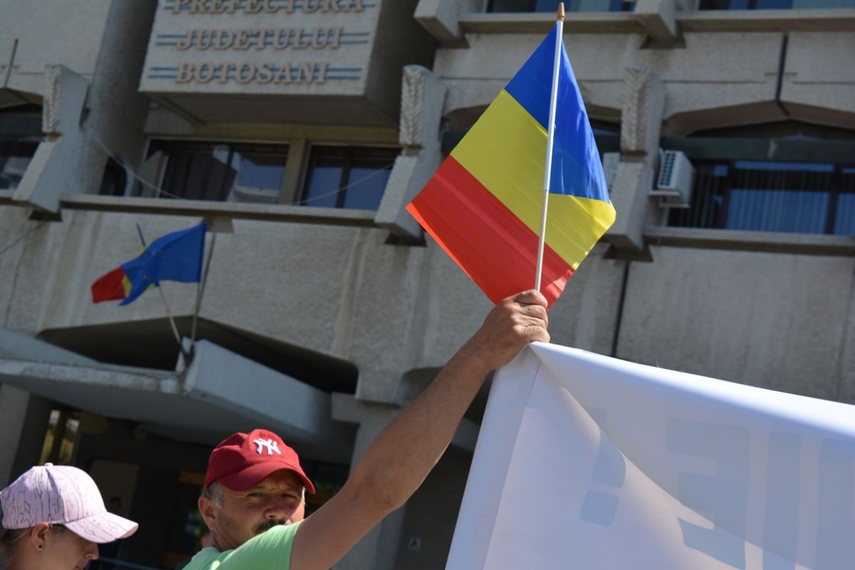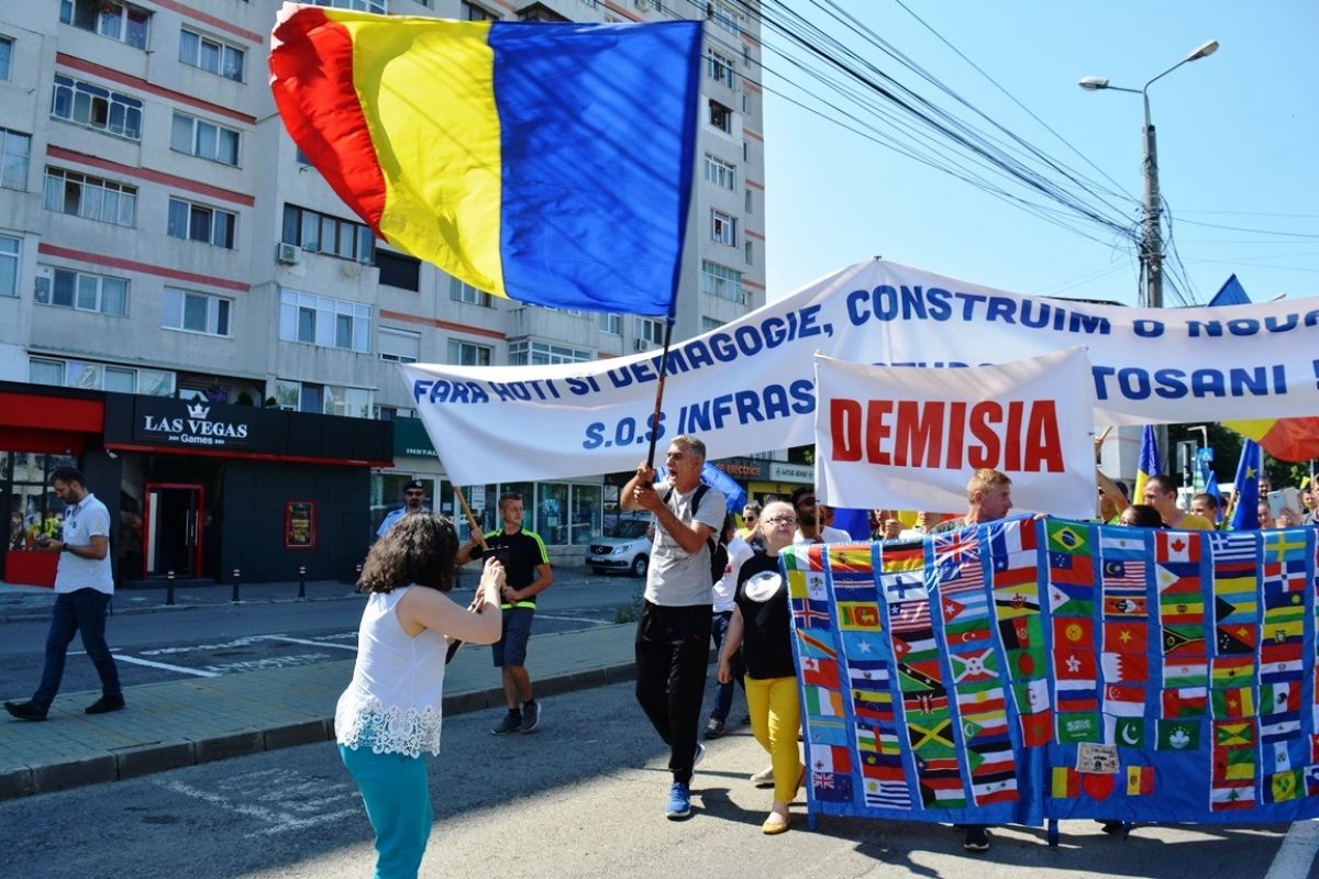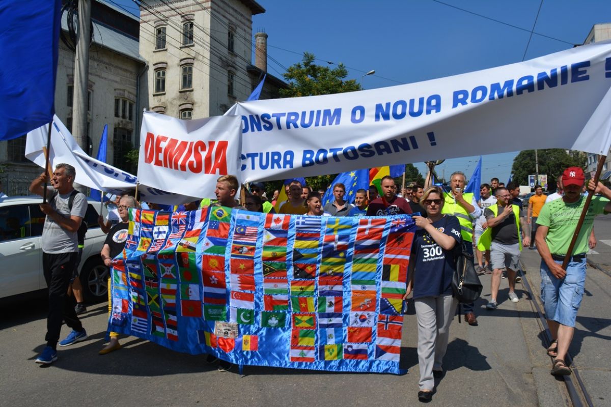 Cordonul celor aproximativ 200 de manifestanți era deschis de un mesh pe care se regăseau zeci de drapele, o reprezentantă a ”Diaspora Unită Ajută România” explicând că sunt steagurile țărilor în care sunt plecați la muncă românii și implicit botoșănenii.