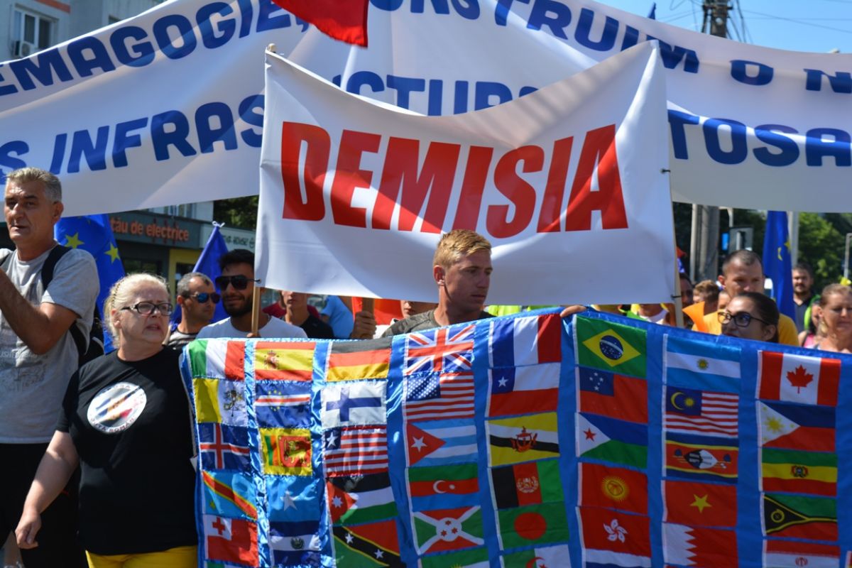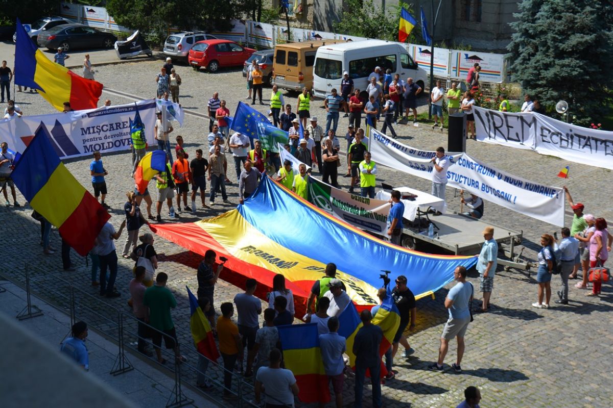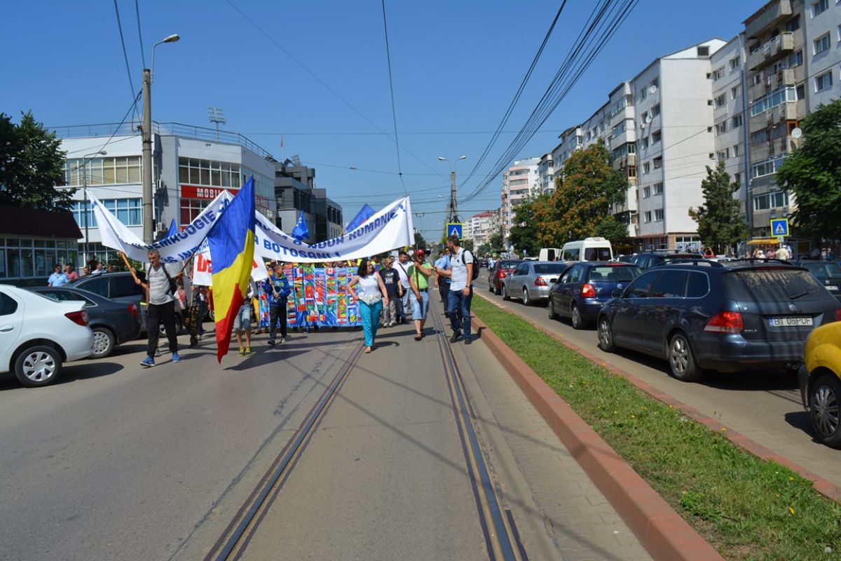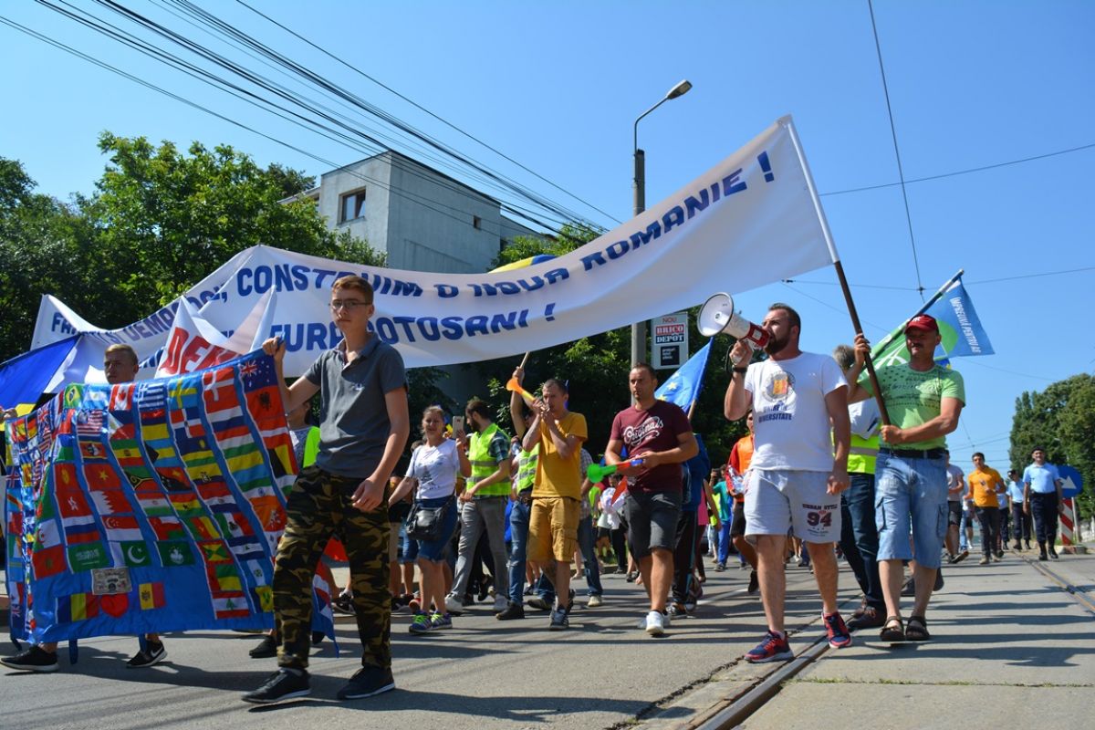 Cordonul celor aproximativ 200 de manifestanți era deschis de un mesh pe care se regăseau zeci de drapele, o reprezentantă a ”Diaspora Unită Ajută România” explicând că sunt steagurile țărilor în care sunt plecați la muncă românii și implicit botoșănenii.