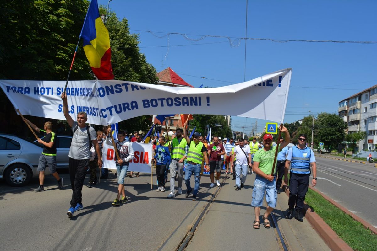 Se fluturau mai multe steaguri, inclusiv unul de dimensiuni generoase, precum și pancarte cu mesajele: ”Demisia”, ”Fără hoți și demagogie, construim o nouă România / SOS infrastructura Botoșani”, ”Stop izolării Moldovei, vrem infrastructură! Ne-am săturat cât ne-ați furat”.