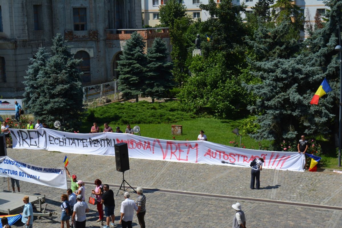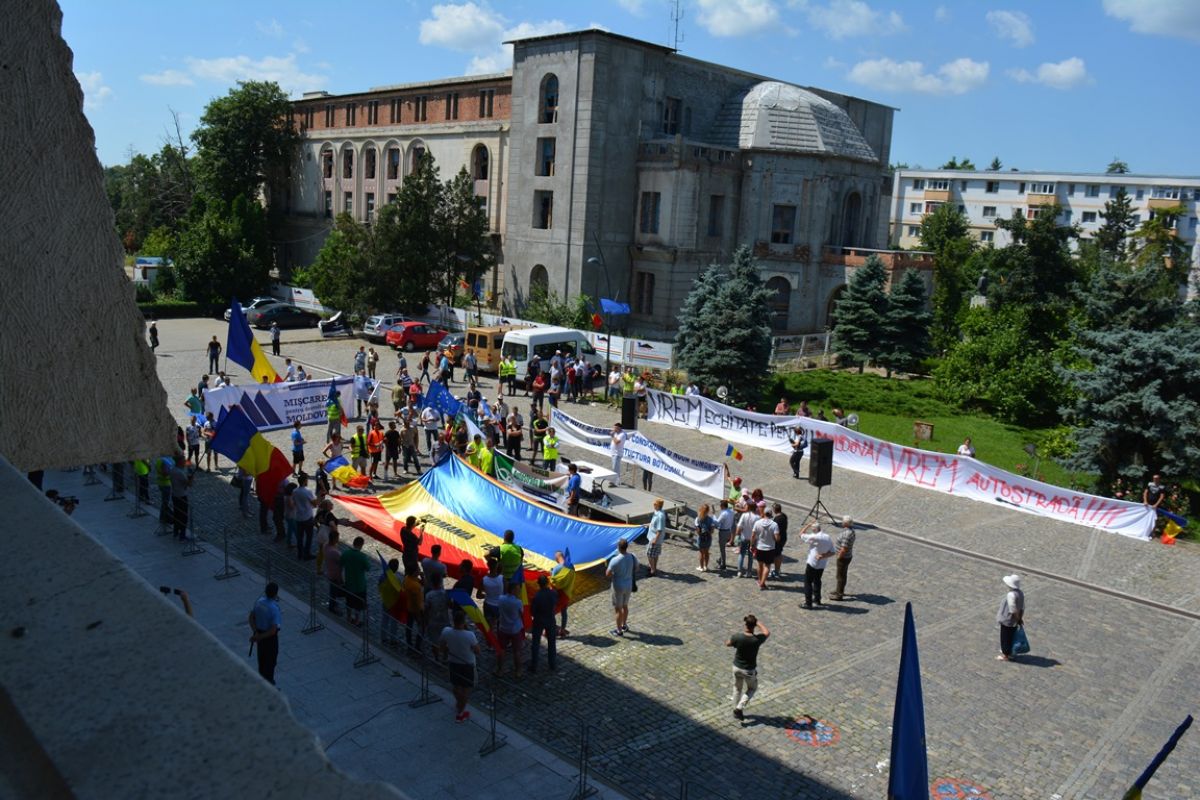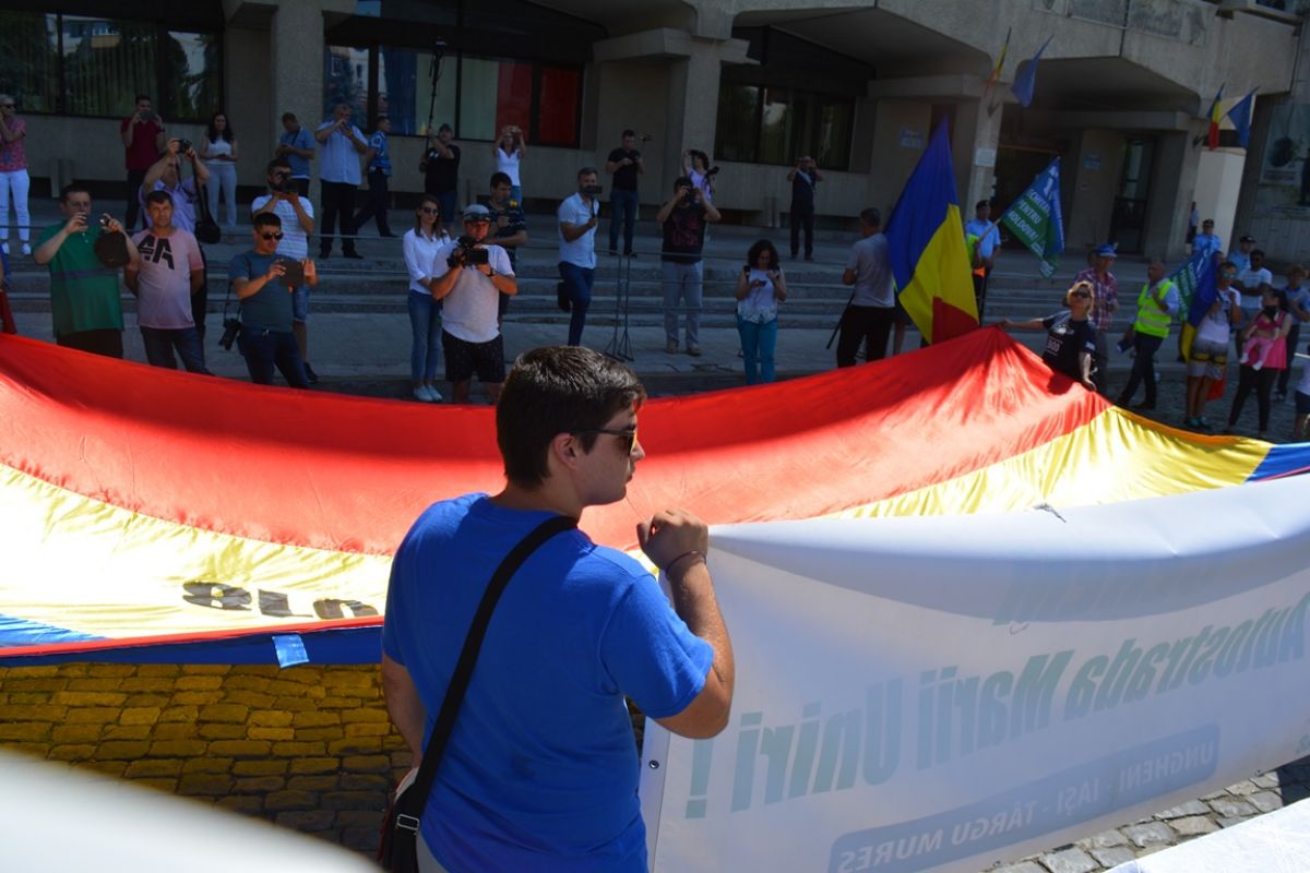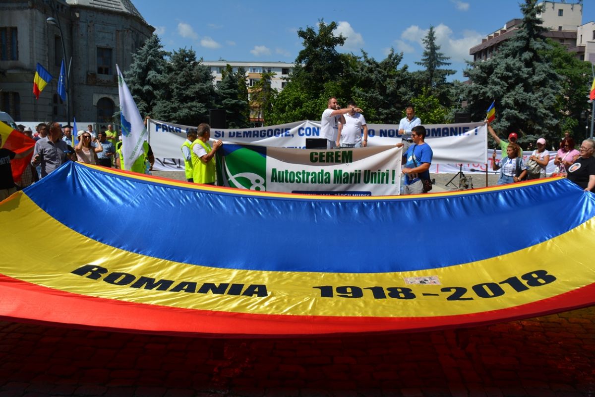 În Piața Revoluției au desfășurat un tricolor imens cu mesajul ”România 1918 – 2018” și un banner de vreo 30 de metri pe care era scris: ”Vrem echitate pentru Moldova, vrem autostradă”.