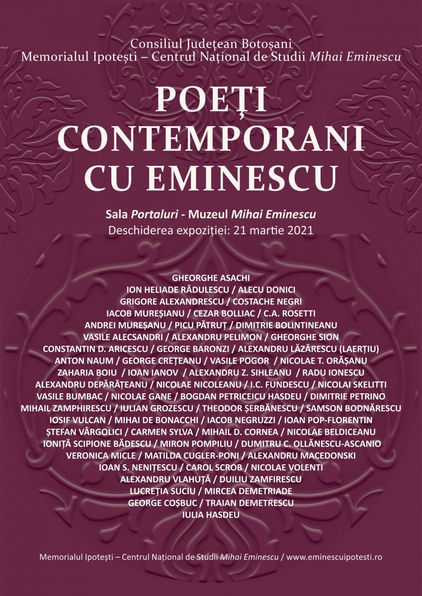 O altă expoziție, intitulată Poeți contemporani cu Eminescu, va fi vernisată, la ora 11.00, în Sala Portaluri a Memorialul Ipotești. În expoziție sunt prezentați 62 de poeți – de la Gheorghe Asachi (1788-1869) la Iulia Hașdeu (1869-1888) – din Moldova, Muntenia și Transilvania, care făceau parte, în anii ′60-′80 ai secolului al XIX-lea, din ceea ce am putea numi procesul poetic românesc: „bătrânii” care mai erau în viață atunci când Eminescu debuta, colegi de la Junimea sau congeneri din alte spații, pe care poetul poate că nu i-a cunoscut, dar fără de care panorama poeziei românești din acea perioadă nu ar fi completă, „tineri” care au debutat până în 1889.