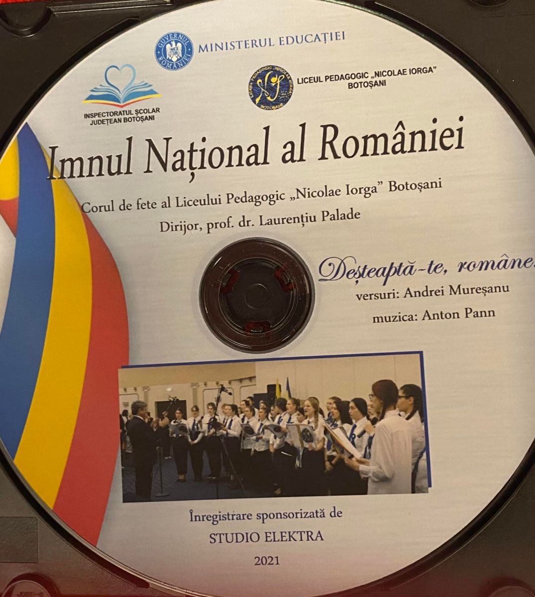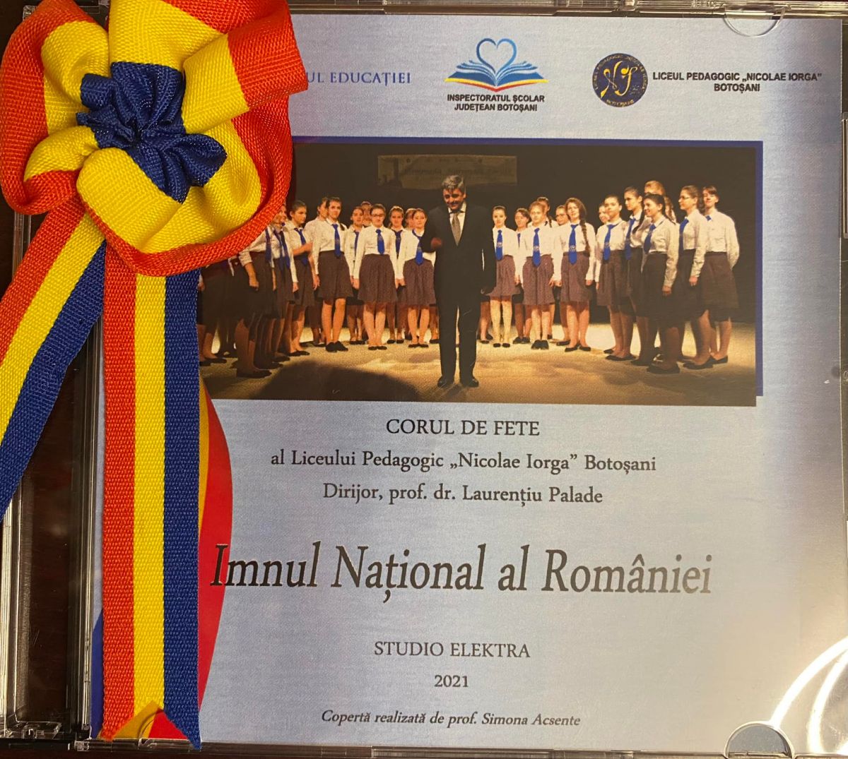 Corul de fete al Liceului Pedagogic “Nicolae Iorga” Botoșani, condus de prof. Laurențiu Palade, și Inspectoratul Școlar Județean Botoșani au oferit, pentru Ziua Națională a României, tuturor unităților de învățământ din județul Botoșani și tuturor instituțiilor statului aproape 200 de CD-uri, cu o înregistrare excepțională a Imnului României.